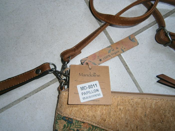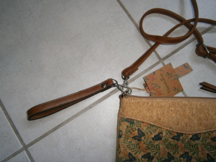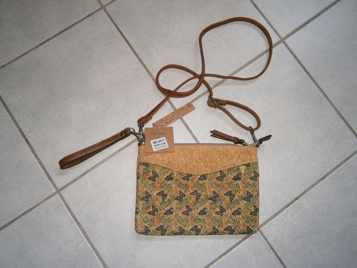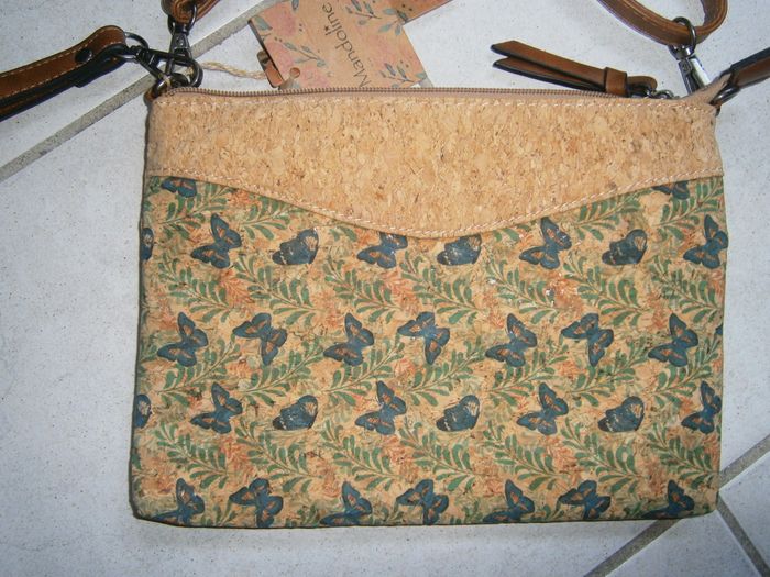 Sac à mains/pochette. NEUF. Couleur beige avec motif "papillon et feuille". 3 poches intérieur dont 1 avec fermeture éclair. 1 poche extérieur avec fermeture éclair. Dimension : 25,50 cm X 19 cm. Lanière épaule réglable. Lanière pour servir en pochette. 100% synthétique/100% végan.