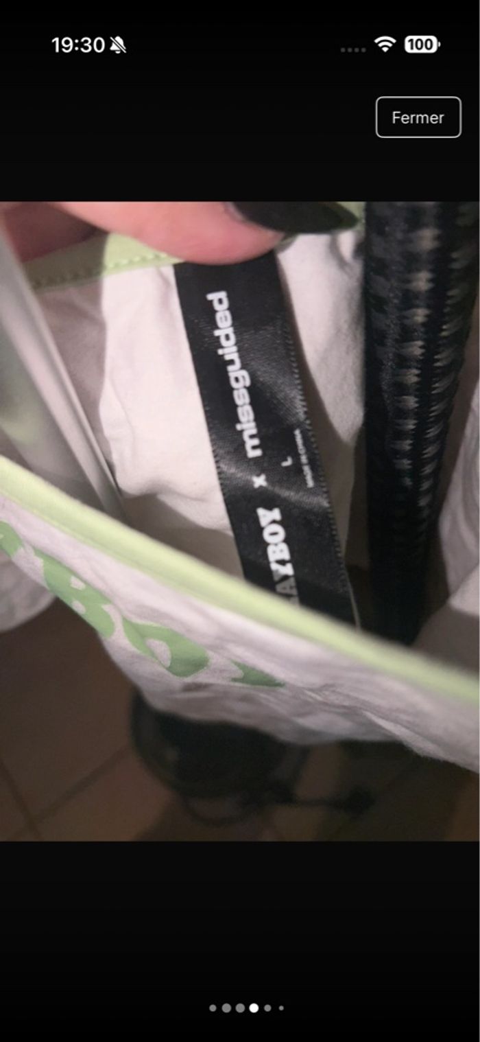 Débardeur blanc avec l'inscription PLAYBOY en vert pastel, détails verts sur les bretelles et les finitions. Coupe courte, style Y2K / vintage, très tendance. Marque : Missguided × Playboy Taille : L Couleur : blanc et vert pastel État : Neuf avec étiquette, jamais porté Matière : coton, doux et confortable Parfait pour l'été, festivals ou looks casual rétro Envoi rapide et soigné. N'hésite pas à me contacter pour toute question !