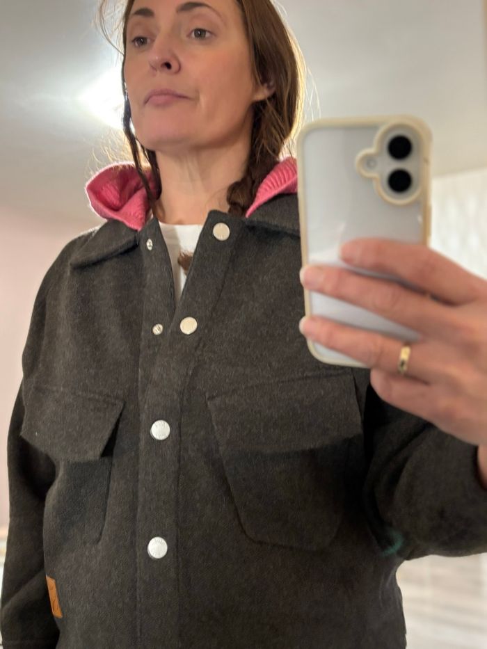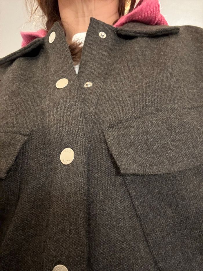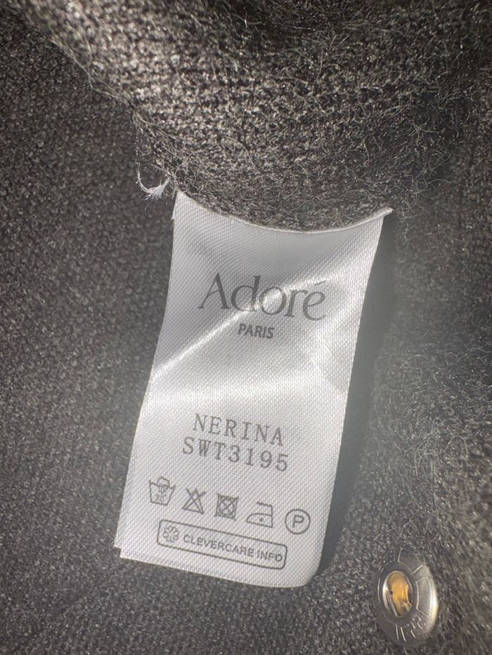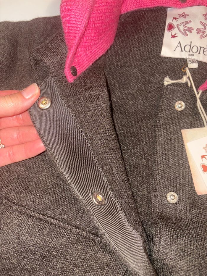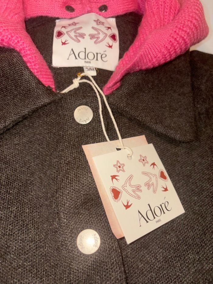 ADORE PARIS Taille S/M Coloris carbone et capuche amovible rose Très belle qualité Prix boutique 109€ Composition : 45,9% viscose, 28,5% polyester, 17,6% nylon, 6% laine