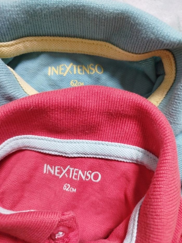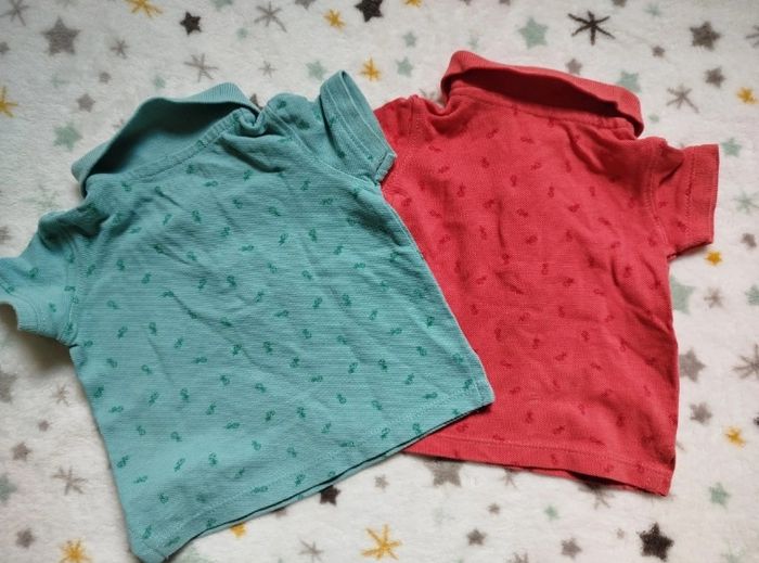 Deux polo à motifs ananas, un bleu et un rouge. In extenso, taille 3 mois. G108