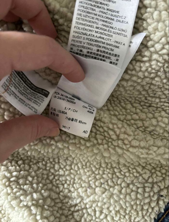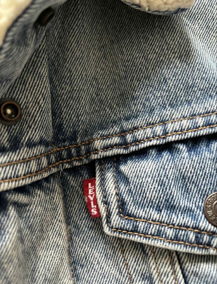 État impeccable — aucun défaut, ni tache, ni usure. Taille parfaitement pour un S (coupe féminine ajustée). Coloris bleu clair légèrement délavé, qui lui donne un joli look vintage années 90. Doublure intérieure en moumoute sherpa très douce et chaude. Attache bouton pression. Porté sur un M/38 ( un peu petit pour cette taille ) mesurant 1m64. Pour donner un petit aperçu. Mesures à plat : • Largeur taille : 47,5 cm • Épaules à épaules : 38 cm • Longueur des manches : 60,5 cm • Longueur totale : 54 cm Modèle 100 % coton, coupe iconique Levi’s, indémodable et facile à associer avec tous les styles. Doublure style fourrure moumoute : 73% polyester, 16% acrylique et 11% viscose. Prix négociable dans la limite du raisonnable. N’hésitez pas si vous souhaitez des renseignements supplémentaires Référence : D1