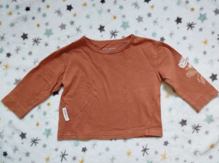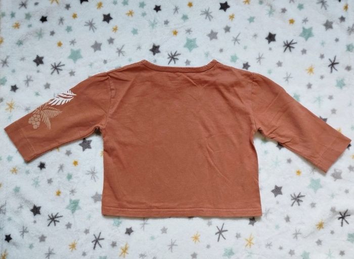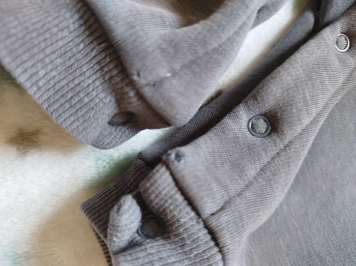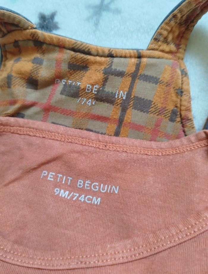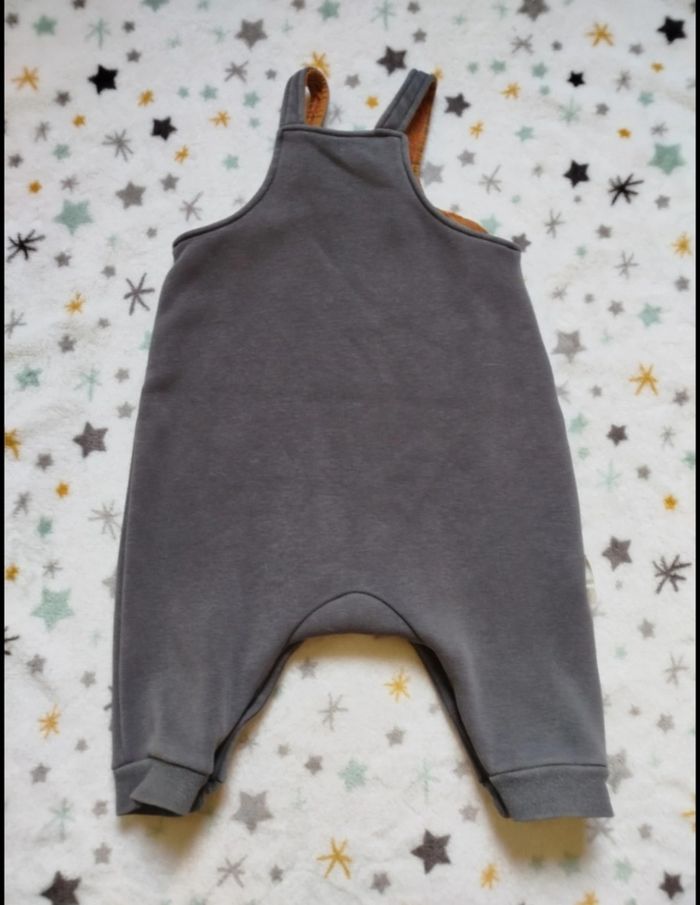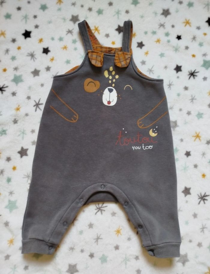 Ensemble salopette grise et t-shirt manches longues marron. Bien porté mais reste en bon état, usure visible en dernière photo. Petit beguin, taille 9 mois. G219