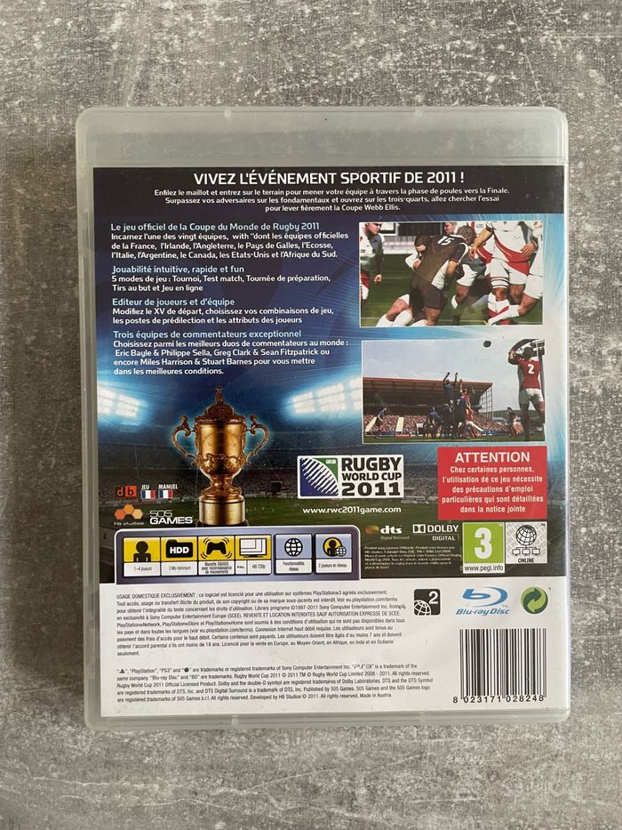 Jeu pour Sony PS3, Rugby world cup 2011 en français. Bon état. Complet avec boite et notice. Envoi rapide et soigné.