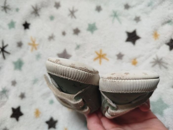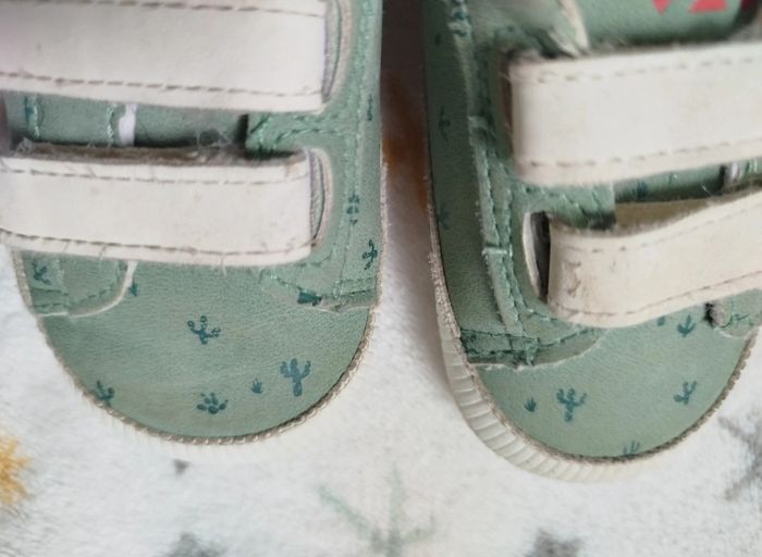 Chaussures souples vertes à motifs cactus. Bébé faisait du quatre pattes donc présentent des traces d'usure dû aux frottements, voir photos. Tape à l'oeil, 6-12 mois, pas de pointure précise. G44