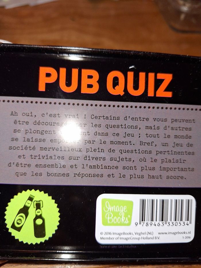 Envie de pimenter vos soirées entre amis ou en famille ? Ce jeu Pub Quiz est parfait pour tester vos connaissances générales dans une ambiance conviviale et décontractée ! ​Le jeu se présente dans une jolie boîte en métal robuste, facile à transporter partout. ​Points forts : ​État : Neuf, jamais servi. ​Contenu : 50 cartes avec des questions variées sur divers sujets (culture, anecdotes, trivial...). ​Format : Boîte métallique compacte "Image Group Holland". ​Ambiance : Idéal pour l'apéritif, les vacances ou offrir en petit cadeau rigolo. ​Exemple de question : "Quel est le nom du roi des fées dans la pièce de théâtre 'Le songe d'une nuit d'été' de Shakespeare ?"