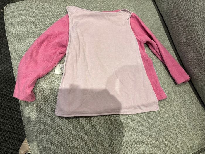 Pyjama raiponce taille 3 ans en polaire. Il est composé d’un haut et un pantalon. Il y a aussi une cape qui se scratch sur le haut