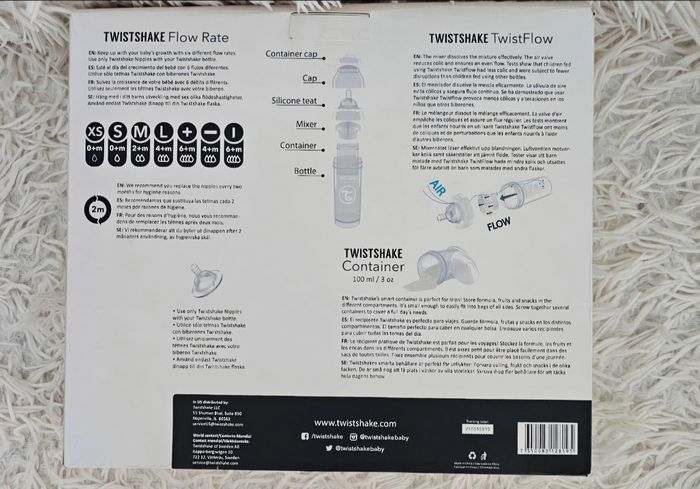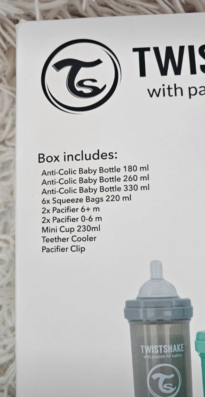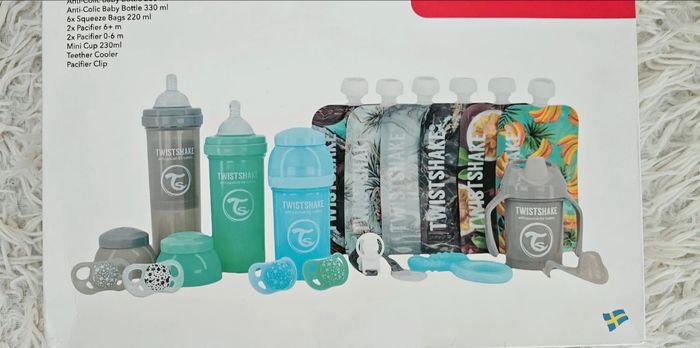 Pack de naissance bebe Twistshake comprenant : ☆ 1 biberon anticoliques bleu clair 180ml ☆ 1 biberon anticoliques vert 260ml. ☆ 1 biberon anticoliques gris 330ml ☆1 tasse d'apprentissage grise 230ml ☆ 6 gourdes réutilisables. ☆ 2 tétines 0-6mois. ☆ 2 tétines 6mois +. ☆ 1 anneau de dentition rafraîchissant. ☆1 attache tétine Pack complet NEUF. Ideal cadeau de naissance