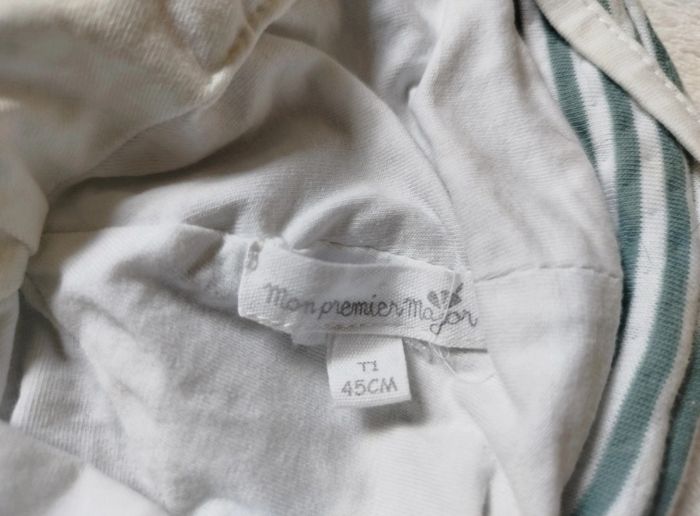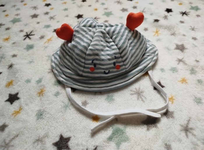 Chapeau épais rayé bleu et blanc, petites pinces de crabe, liens de serrage. Sergent major, taille 1 (45cm de tour de tête). Peu porté. G41