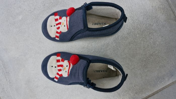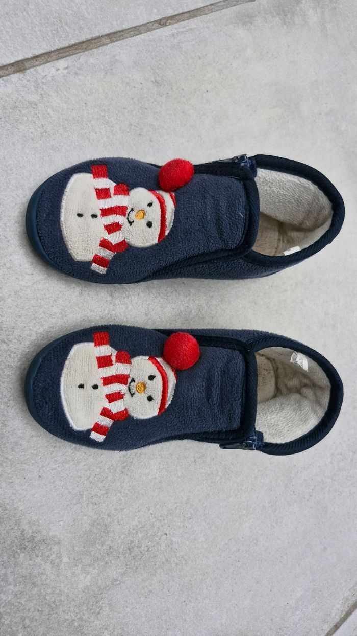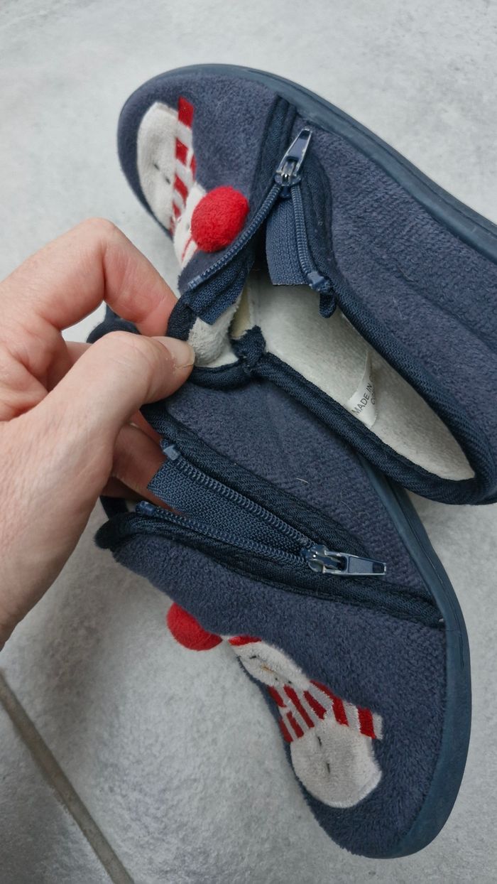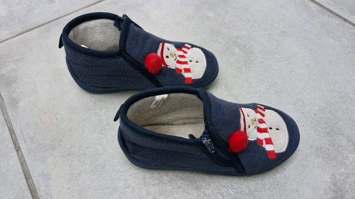 Marque Kiabi. Semelles antidérapantes. Motif bonhomme de neige avec pompon en relief sur le dessus. Fermeture par zip. Très bon état général.