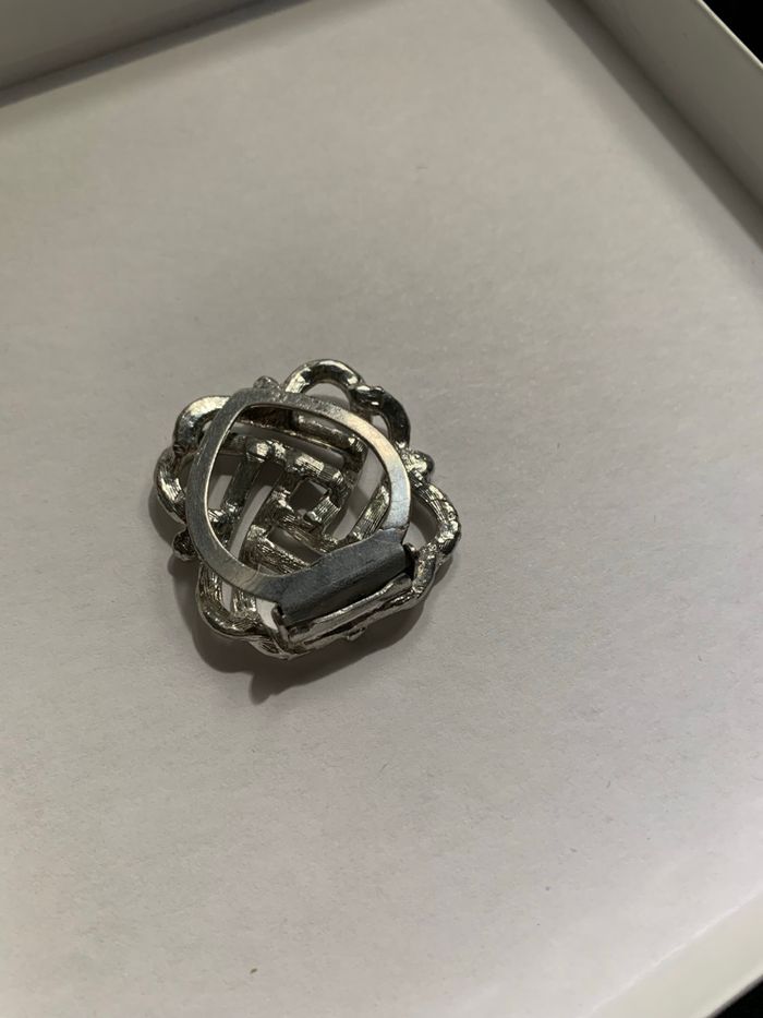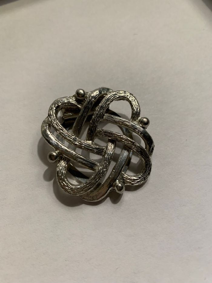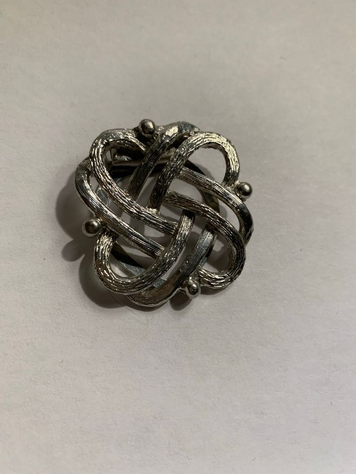 Pince à foulard argentée vintage avec motifs entrelacés. Très bon état