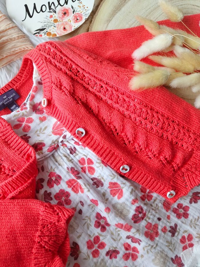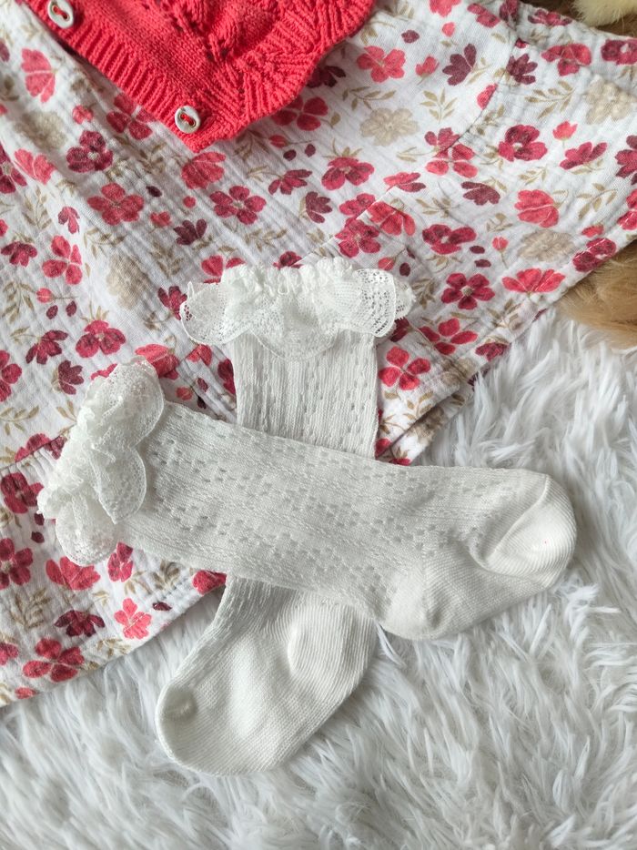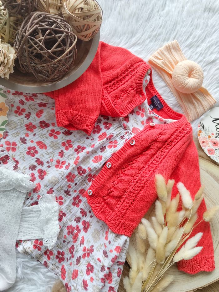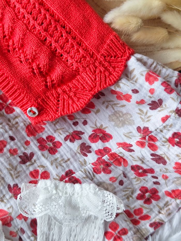 ✅ Excellent état ✅ Ensemble magnifique complet 4 pièces ✅ Cardigan/gilet bouton fleuri + robe fleurie manches longues en gaze de coton ✅ Bandeau cheveux Neuf + chaussettes hautes neuves 🌸 N'hésitez pas à vous abonner à mon dressing, mise en ligne régulièrement 🌸