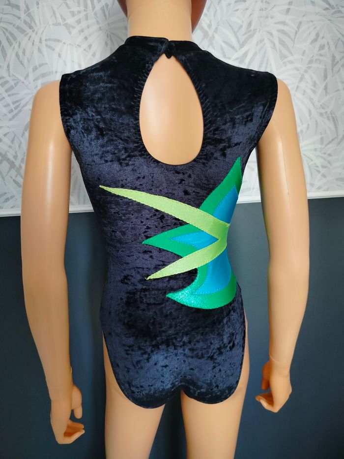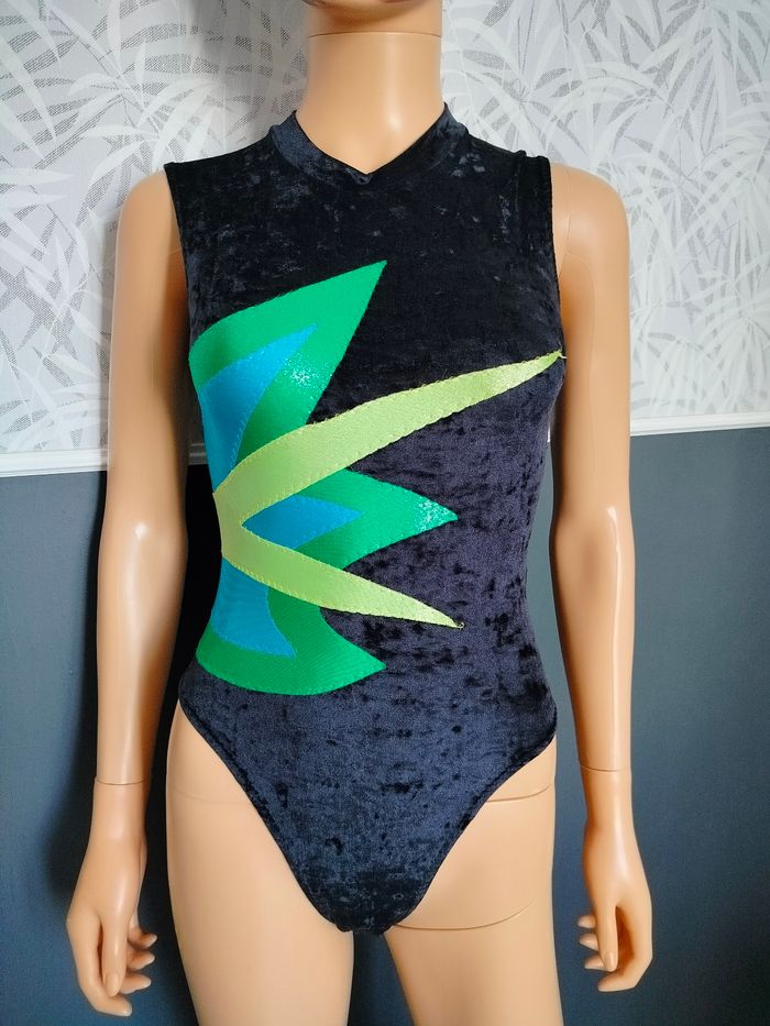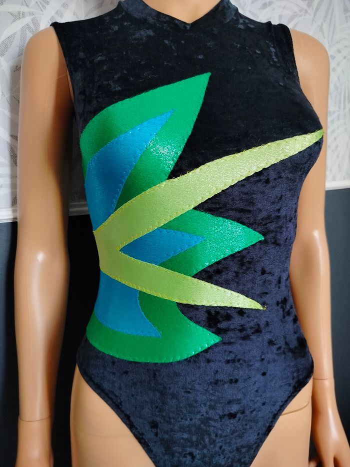 Body vintage de gymnastique des années 90. De taille indiquée 36 mais taille en réalité T34. En très bon état. Empiècements en tissu avec lurex vert, bleu et jaune et tissu noir en velours. Marque Léna sport, fabrication française 🇨🇵. En 80% polyamide et 20% élasthanne. Crochet discret en fermeture dans le cou. Col ras de cou. Réf H*517 📏 Épaules : 29cm Aisselles : 31cm Longueur : 62cm
