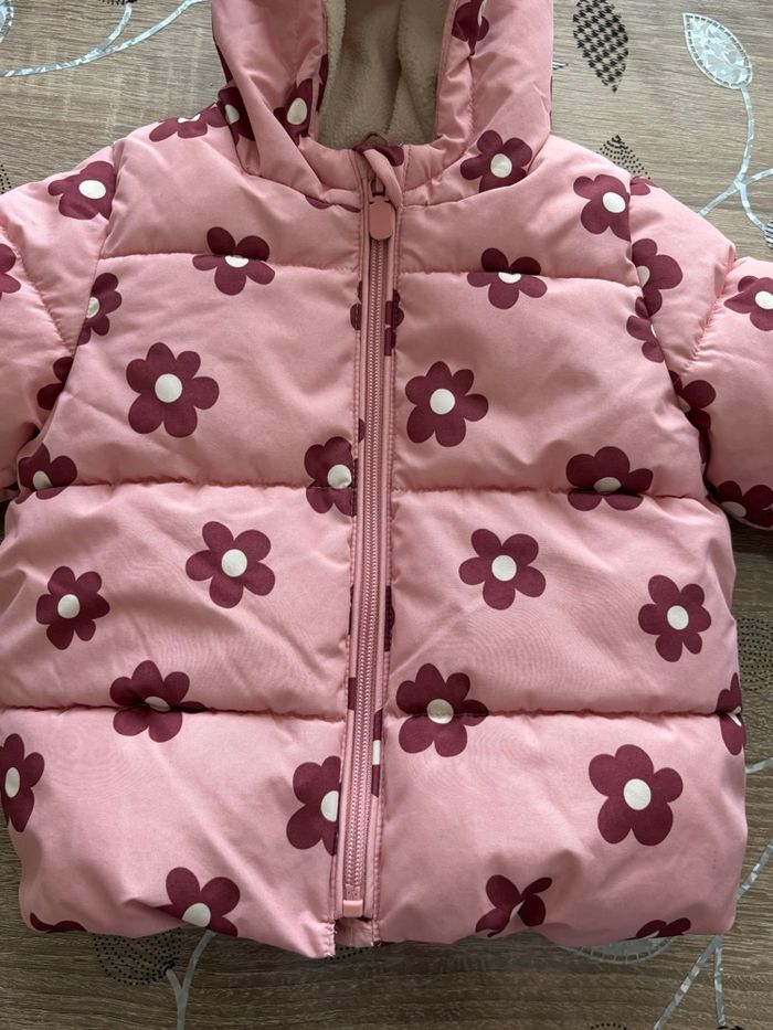 Jolie doudoune rose à capuche, motifs fleurs, bien chaude et confortable. Fermeture zippée. Très bon état, idéale pour l’hiver. Marque : Kiabi Encore vendu actuellement à Kiabi 17€ Taille : 12 mois 80 cm