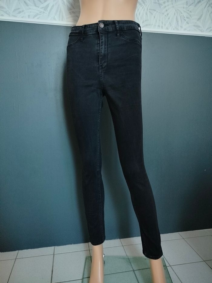 Jean noir délavé, taille haute, de taille indiquée W27 L29 soit une T34. En très bon état. Marque Hollister. Coupe skinny. Étiquette de composition coupée, mais il est élastique donc possède de l'élasthanne. Réf B*143 📏Taille : 34cm Longueur : 96,5cm