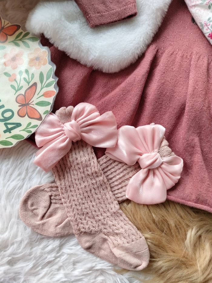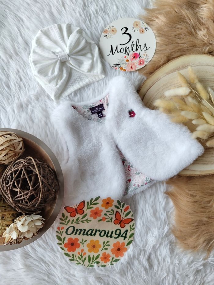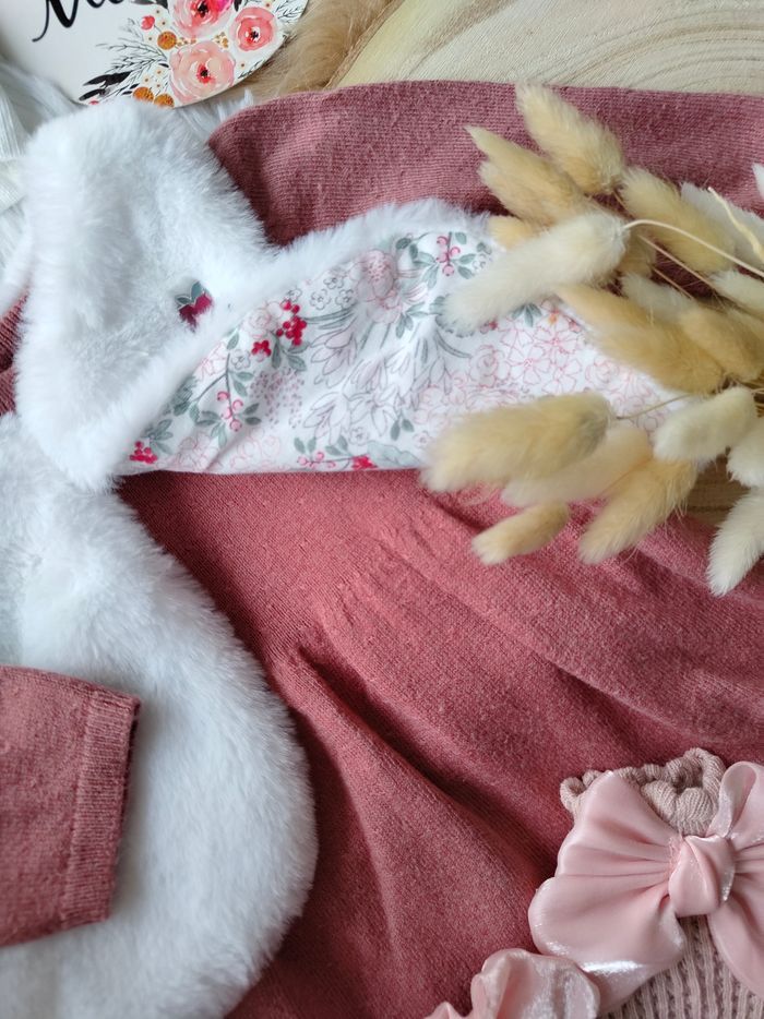Excellent état ✅ Ensemble magnifique complet 4 pièces collection "chouquette à Paris" ✅ Gilet fourrure réversible fleuri sans manches + robe tricot piqué broderie fleurie manches longues ✅ Turban/bonnet Neuf et chaussettes hautes neuves 🌸 N'hésitez pas à vous abonner à mon dressing, mise en ligne régulièrement 🌸