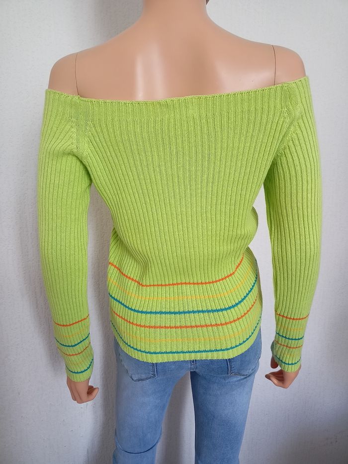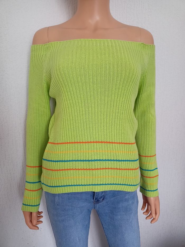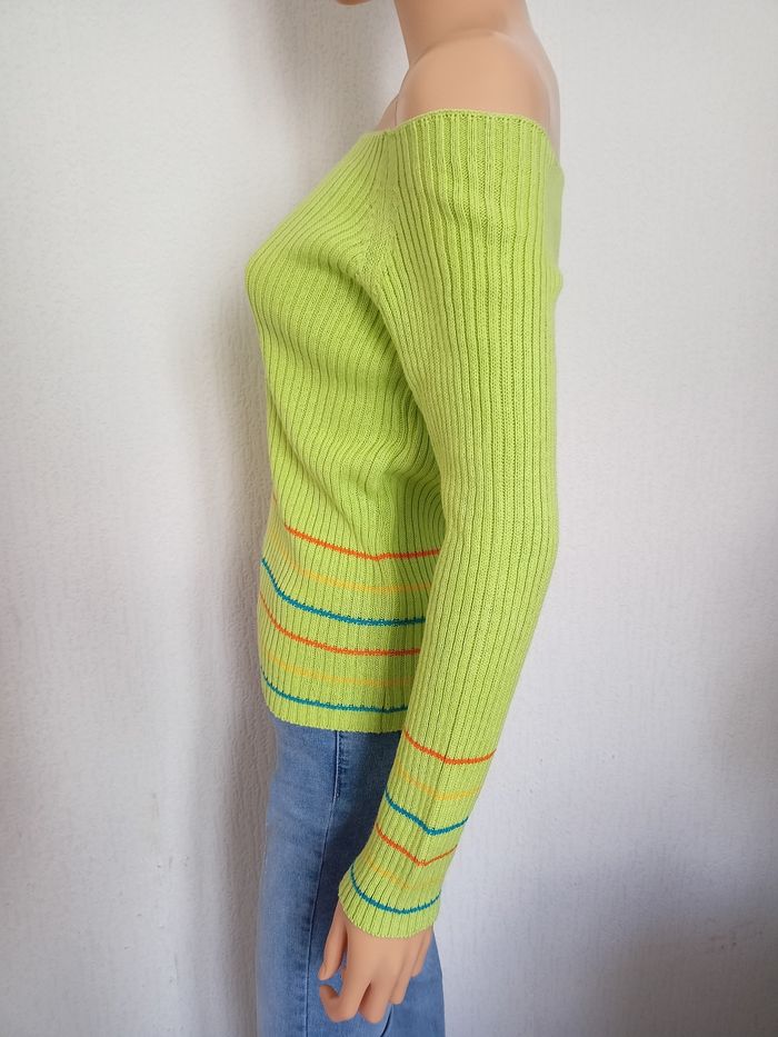 Pull épaules dénudées, de couleur vert fluo avec rayures jaune, orange et bleu. Taille S. En très bon état. De Style vintage années 2000. Il est entièrement côtelé. Marque JSI. Réf N*24 📏Mesures: épaules : environ 36cm Aisselles : 41,5cm Longueur : 47,5cm