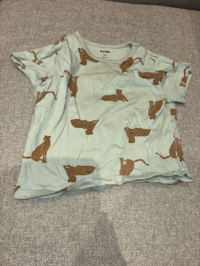 Pyjama vert avec des léopards dessins blancs. Il est composé d’un t-shirt et d’un short En bon état Taille 2 ans