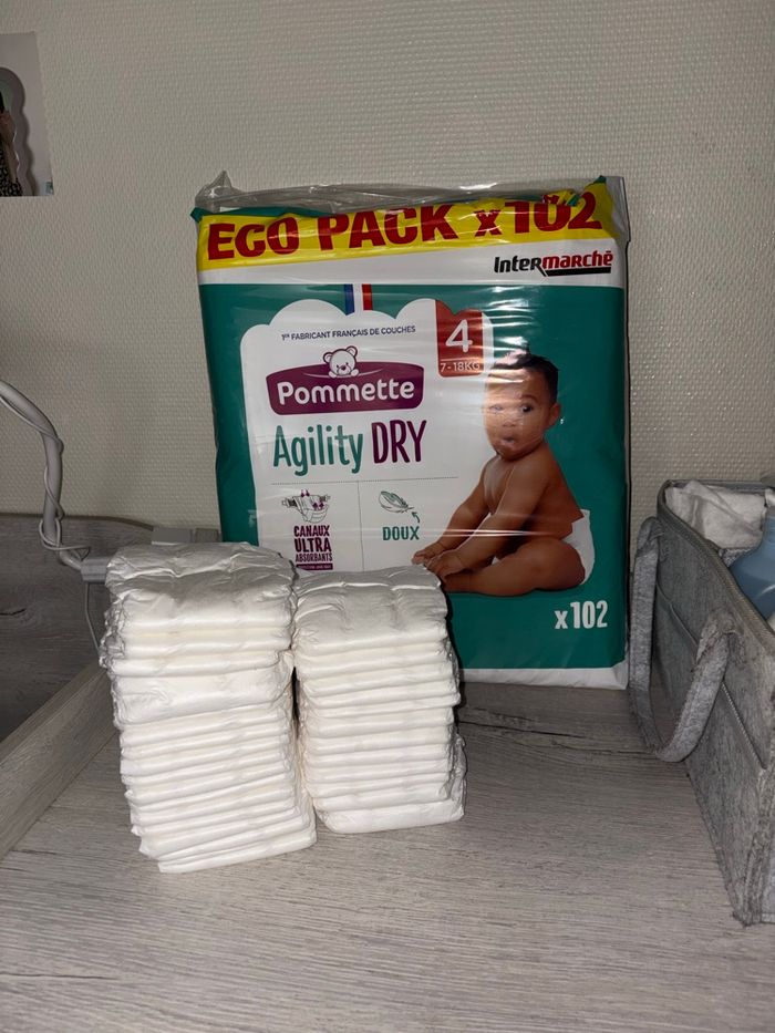 Je vends des couches de mon fils 13€ Paquet neuf, à juste était ouvert, je me suis trompée de taille. Il s’agit de couches taille 4 (7–18 kg), marque Pommette Agility Dry. • quelques couches taille 4 issues d’un autre paquet, car la taille ne lui va plus.