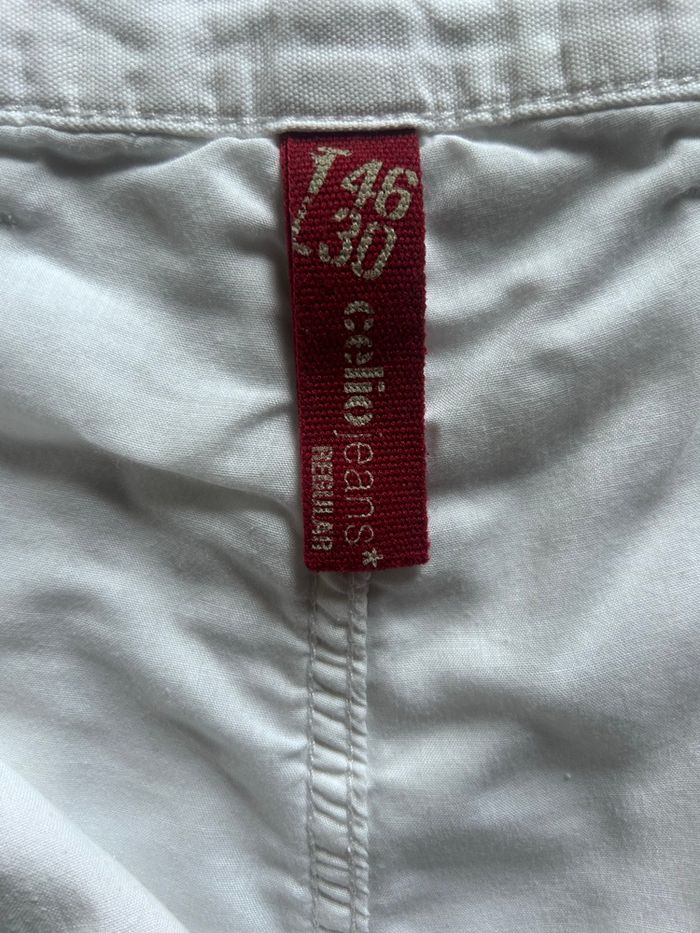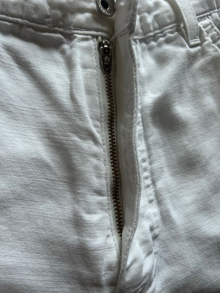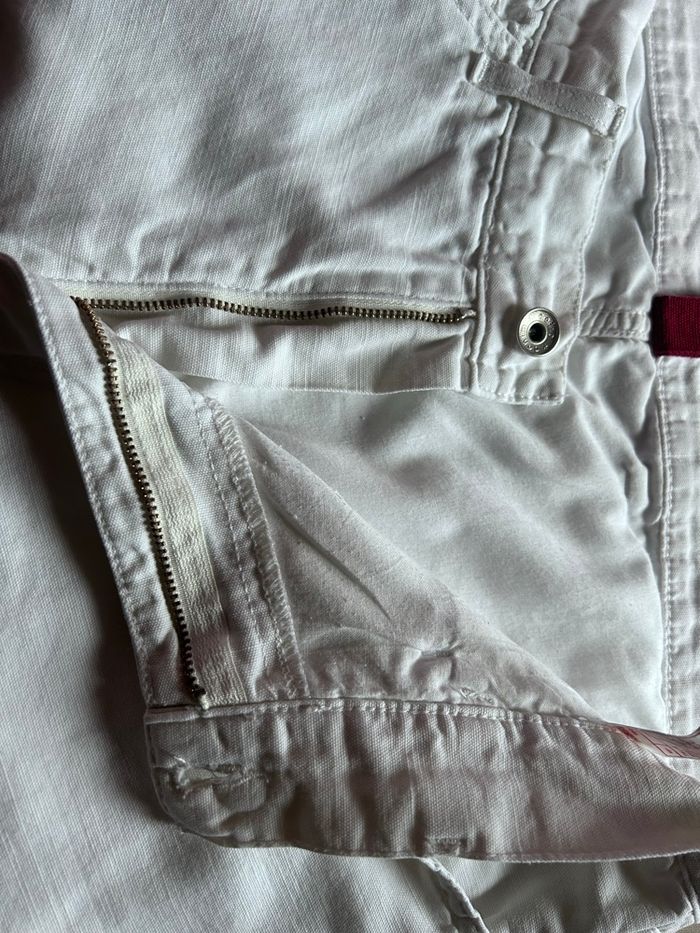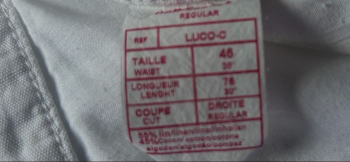 Pantalon droit blanc, doublé sur le haut seulement. 55% lin 45% coton Taille 46 ou W36 L30 Celio jeans regular La ceinture mesure à plat 45,3 cm Longueur côté 102,7 cm Longueur entre jambe 75,5 cm Largeur à plat bas des jambes 21,5 cm