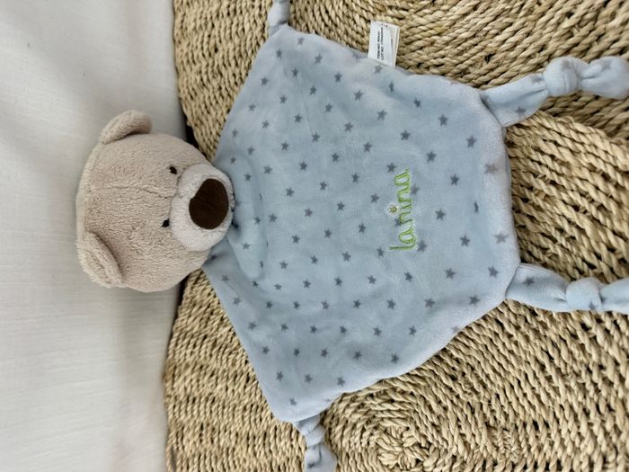 La Nina Doudou Ours Plat Beige Bleu Etoiles Noeuds  - photo numéro 1