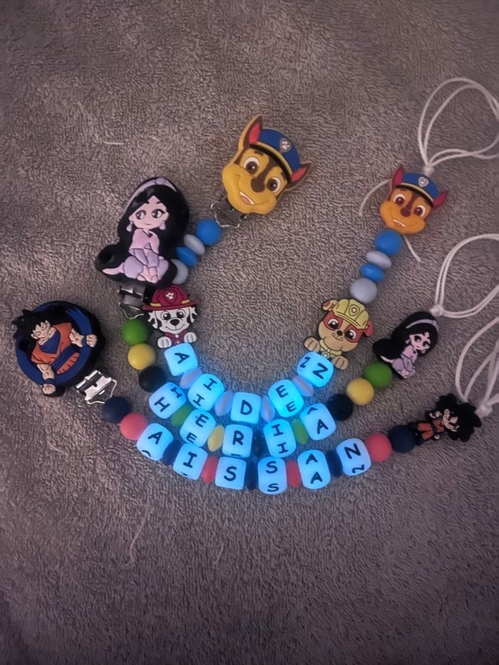 Pour passer la commande il suffit de valider le paiement sur l'annonce du modele désiré et de m'envoyez le prénom de l'enfant par message que je puisse réaliser votre commande. A partir de 2 articles vous bénéficiez de 5% de réduction. Réalisation dans la journée l'adaptateur tétine mam et en supplément à 1€ Si vous souhaitez quelque chose en particulier n’hésitez pas à m’envoyer un message qu’on voit ça ensemble 🥰 Une photo peut être envoyé avant l’envoi bien sûr ☺️