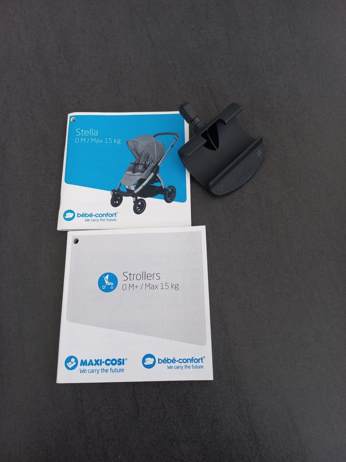 Poussette modèle Stella 0-15 kg Coloris noir Bâche de pluie, adaptateurs cosi, fixation ombrelle, reducteur de naissance Poignée télescopique Quelques traces d'usure Notice et carton d'origine