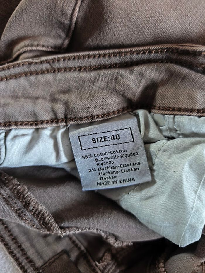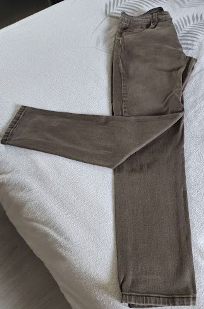 Jean marron clair, 98% coton, 2% élasthanne, longueur entrejambes 70 cm, taille à plat 38 cm, bas jambes 14 cm, stretch
