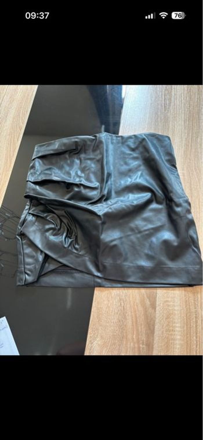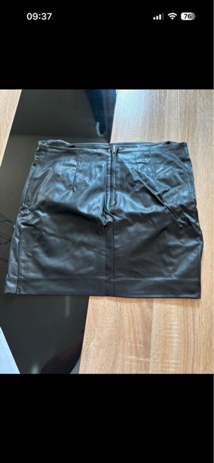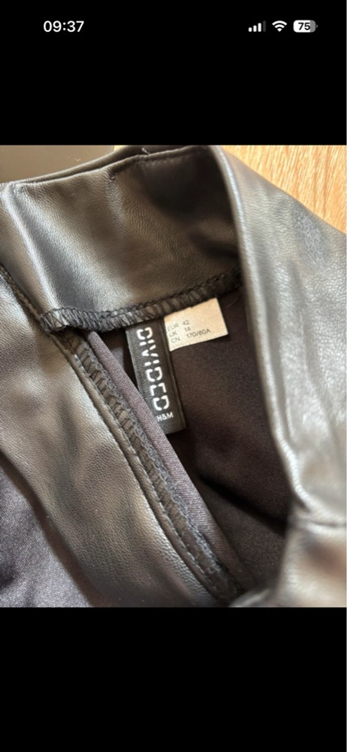 Jupe noir effet cuir 100% polyester Fermeture éclair + bouton à l’arrière Très bon état H&M taille 42