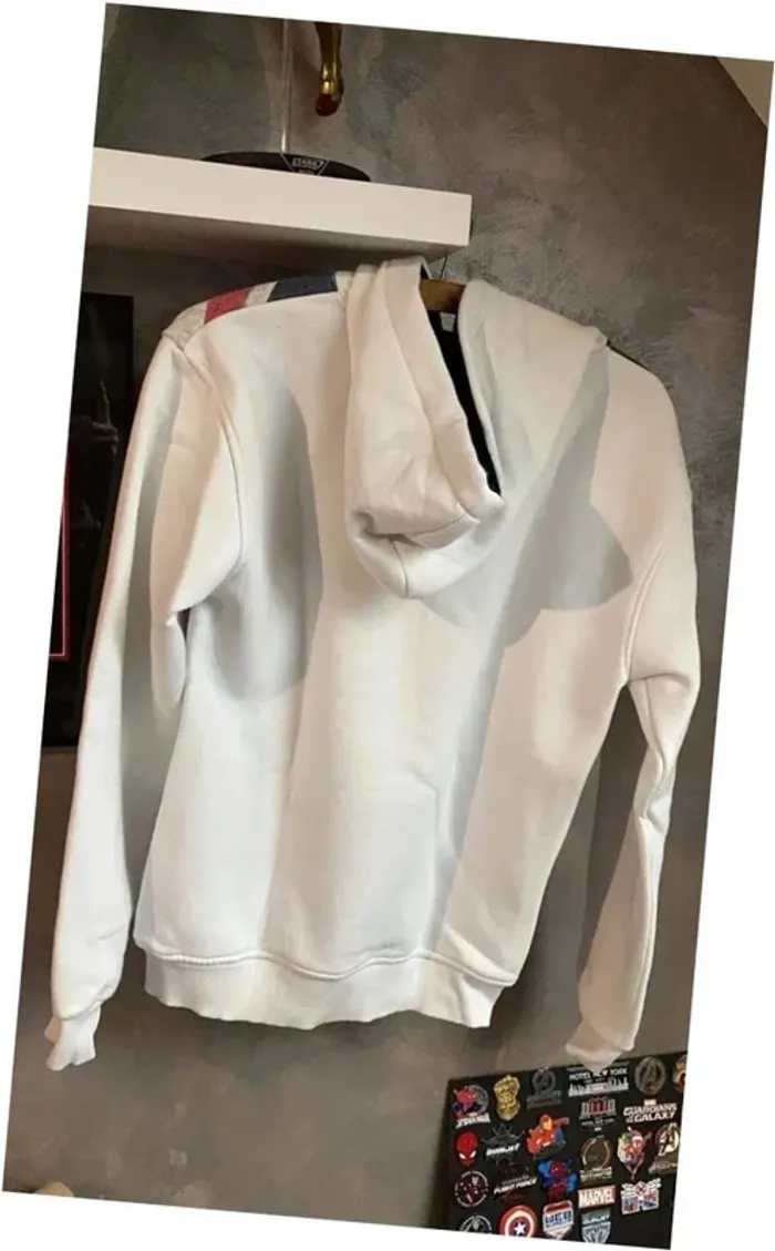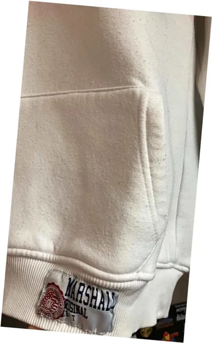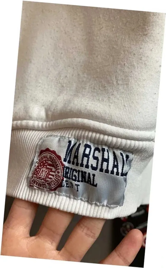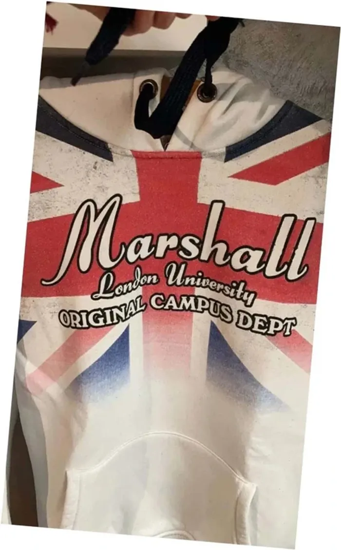 Bonjour, je vend un sweat Marshall London University en taille S pour homme. Drapeau anglais sur le devant. Le sweat est en très bon état général mais deux petits défauts à noter : un fil tiré sur un des cordons de la capuche, et quelques petites peluches sur le sweat. Il a été lavé avant d’être mis en vente.