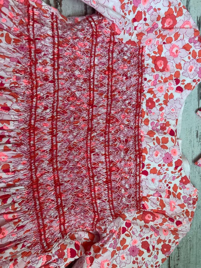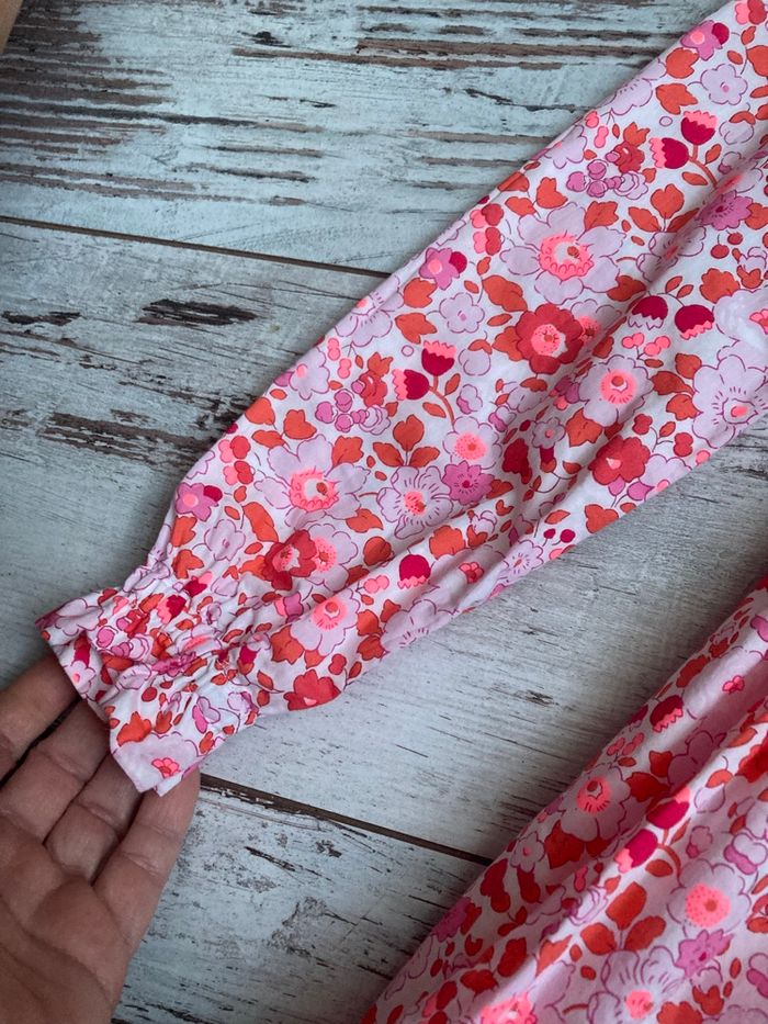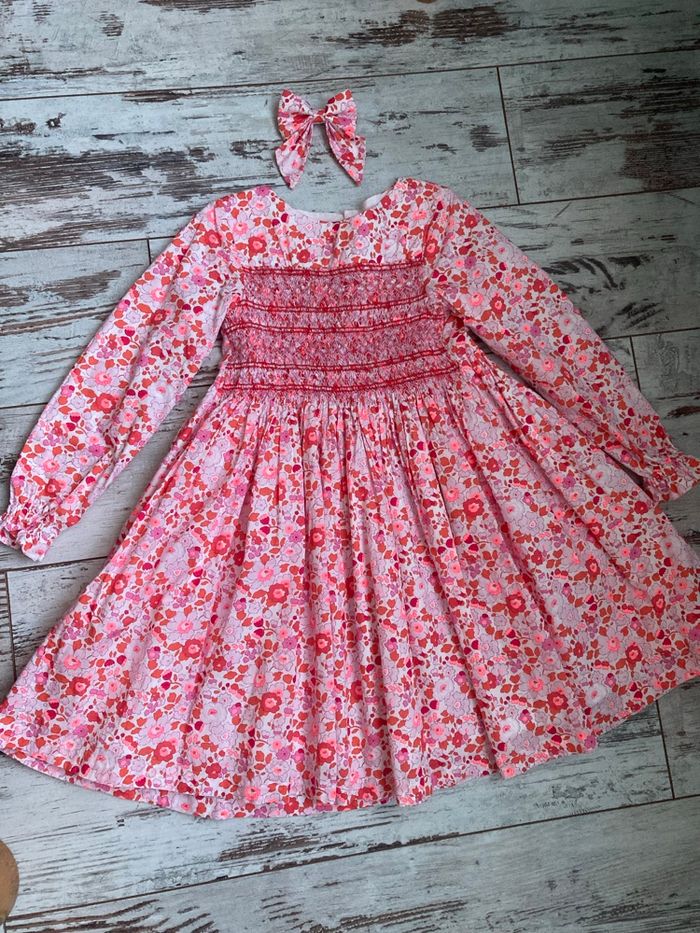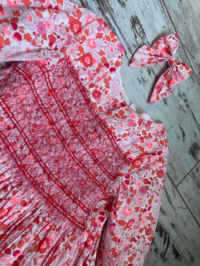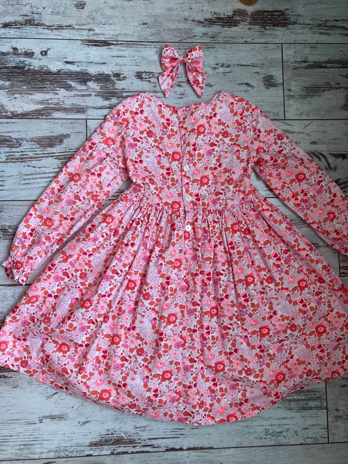 Magnifique duchesse creatrice en Liberty betsy fraise caramel entièrement doublée même les manches Taille 6 ans Barrette creatrice Prix ferme achetée 180e sans la barrette
