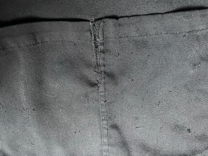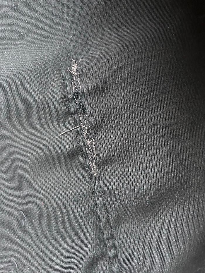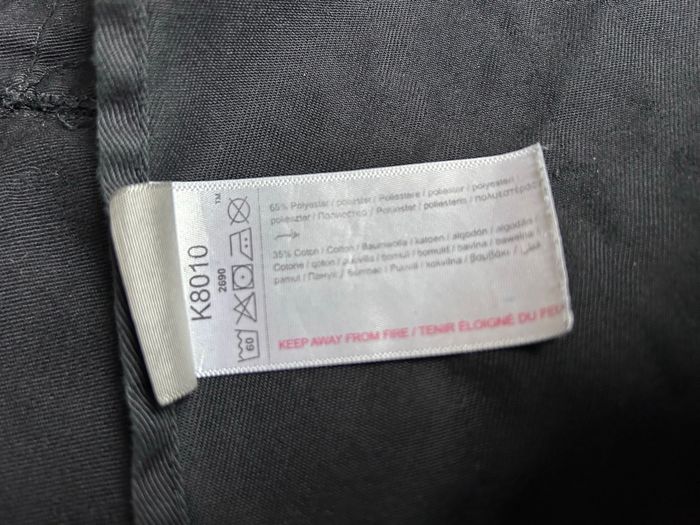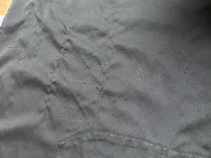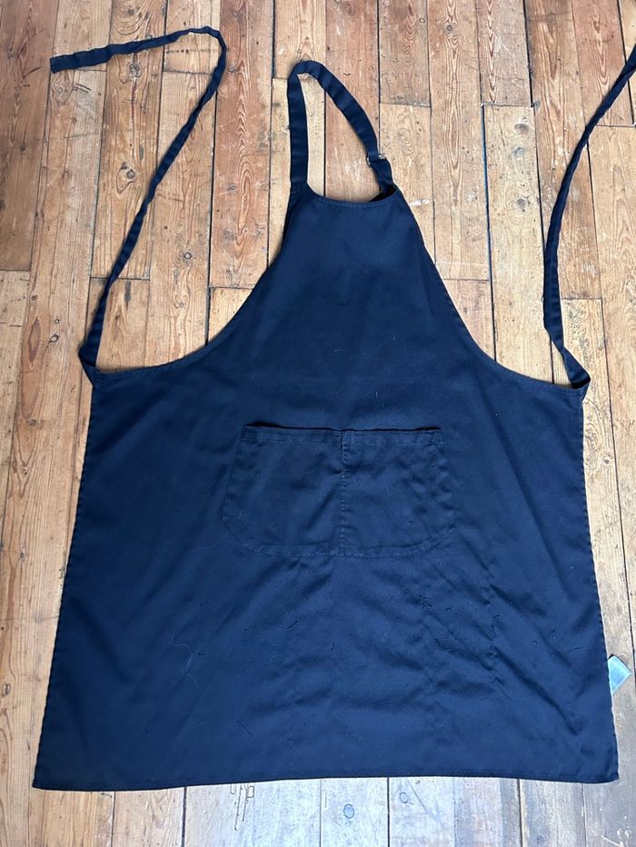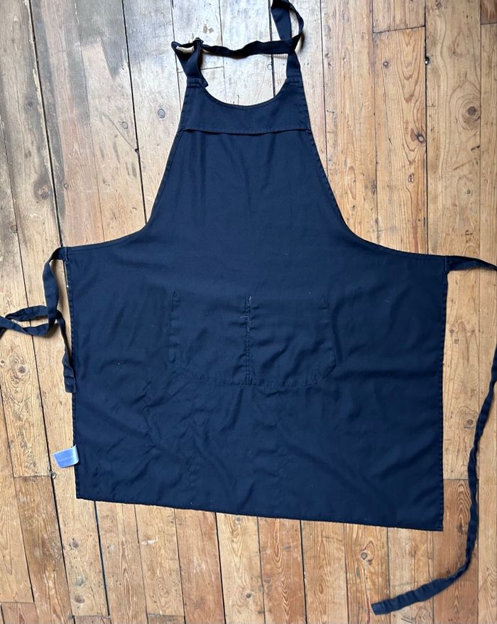 Tablier noir de cuisine Kariban Poche 2 compartiments 65% polyester 35% coton Lien tour de cou réglable Largeur tout en bas 82,3 cm Longueur milieu devant avec la bavette sans compter l’attache 87 cm État satisfaisant car : A été recousu à la poche Fil tirés