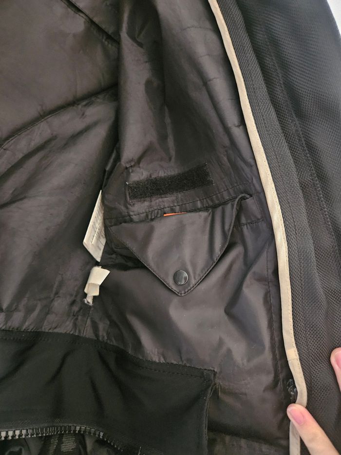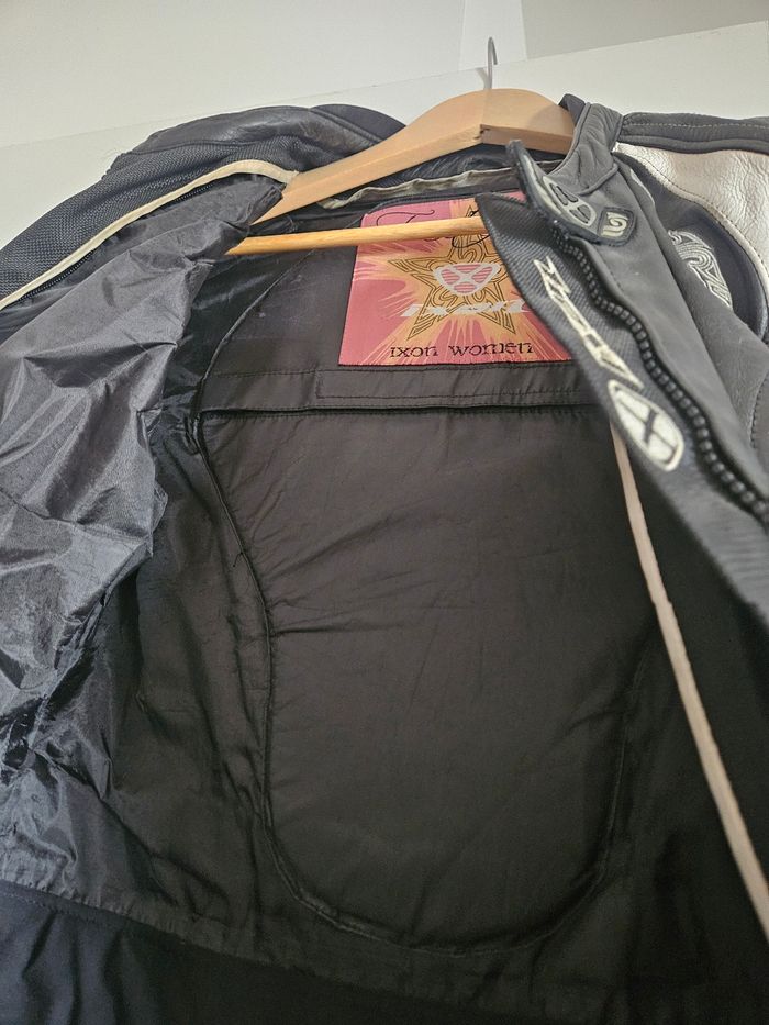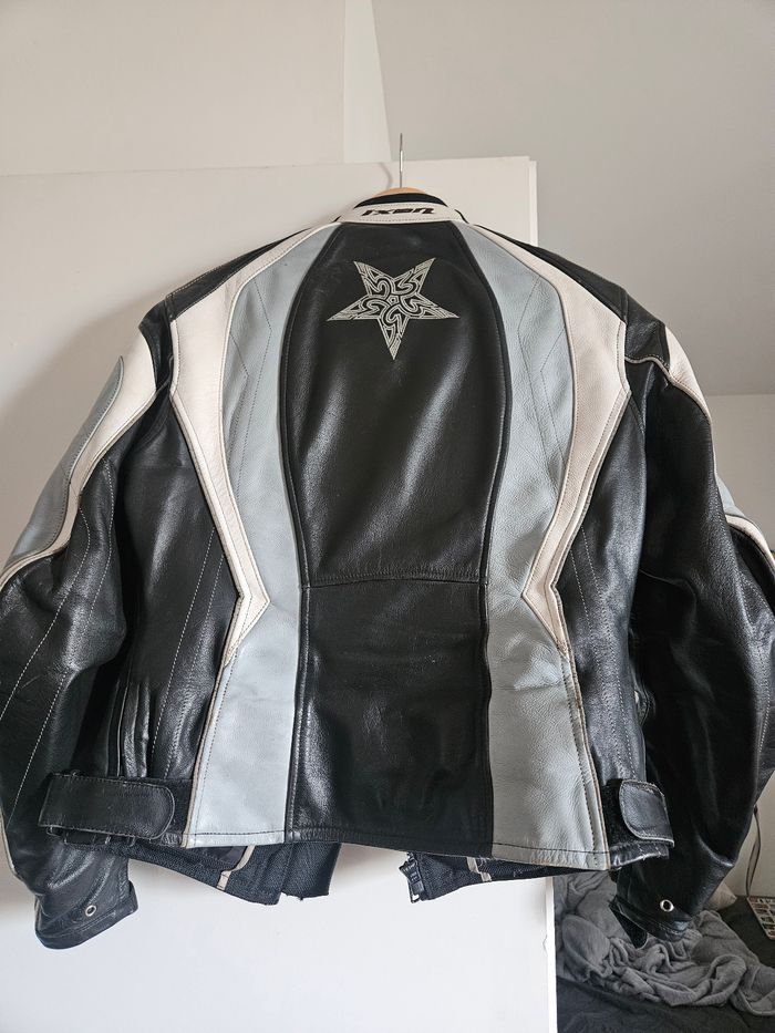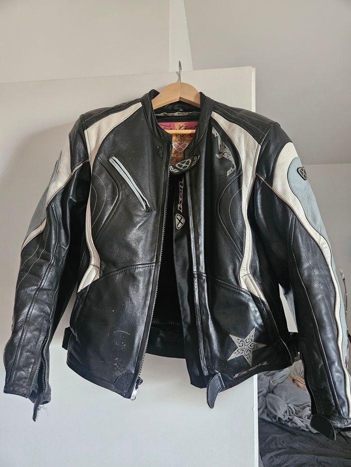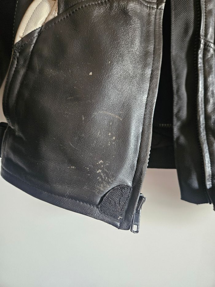 en cuir Coques aux épaules, coudes et mousse dorsale Doublure hiver modulable 2 poches internes et 3 externes Fermeture au bassin pour raccorder avec un pantalon ixon Plusieurs imperfections dû a l’usure