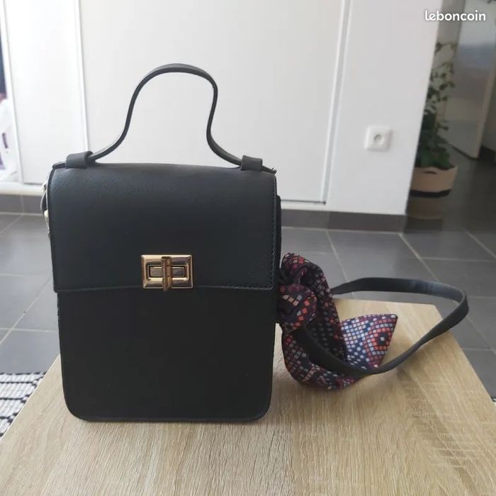 Sac à main noir élégant, style cartable avec fermoir doré. Bandoulière ajustable, foulard coloré inclus, très bon état.