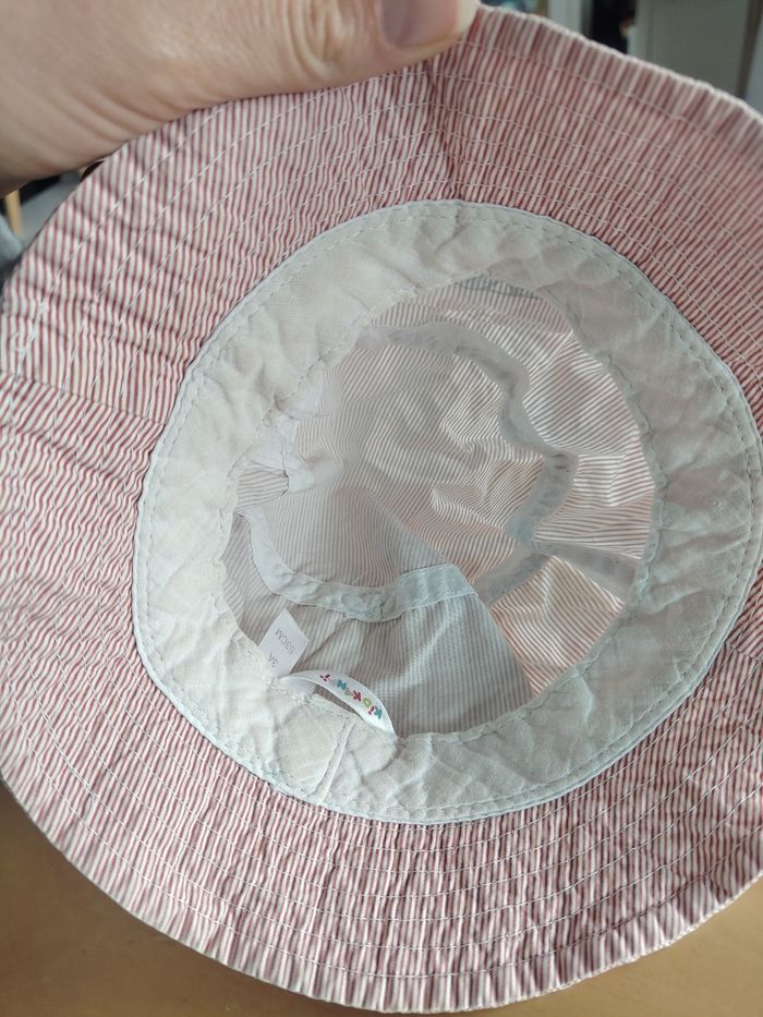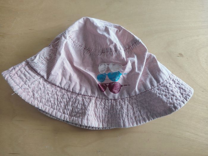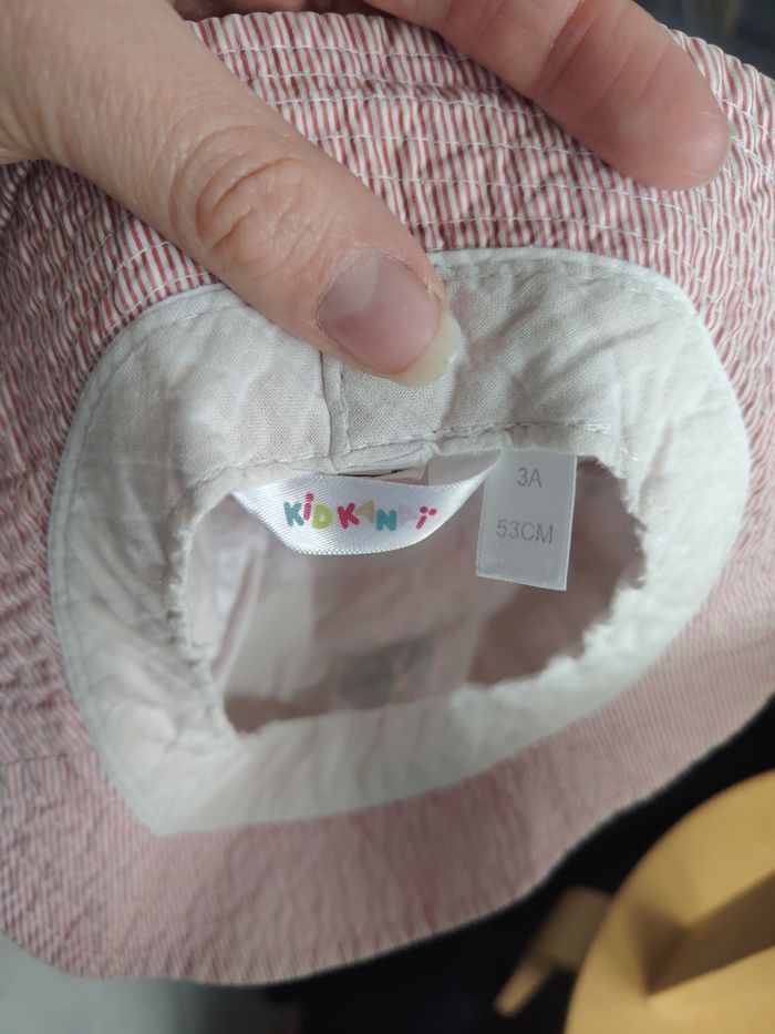 Chapeau d'été en taille 3ans (53cm) ma fille l'a aussi porté à 4 ans. Il est en très bon état général mais le contour blanc a l'intérieur est un peu jauni car c'était son chapeau pour l'eau à l'océan. Marque: kidkanai