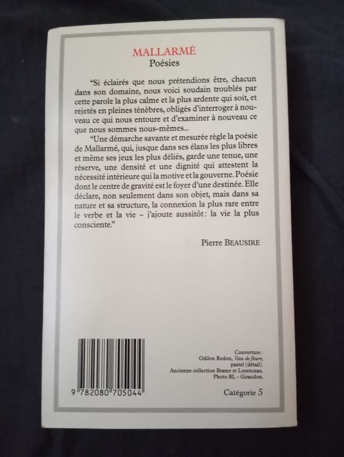 Je vends ce recueil de poésies "Poésies" de Mallarmé, édition brochée. - Titre : Poésies - Auteur : Mallarmé - Éditeur : Flammarion - Collection : GF Bon état N'hésitez pas à me contacter pour plus d'informations !