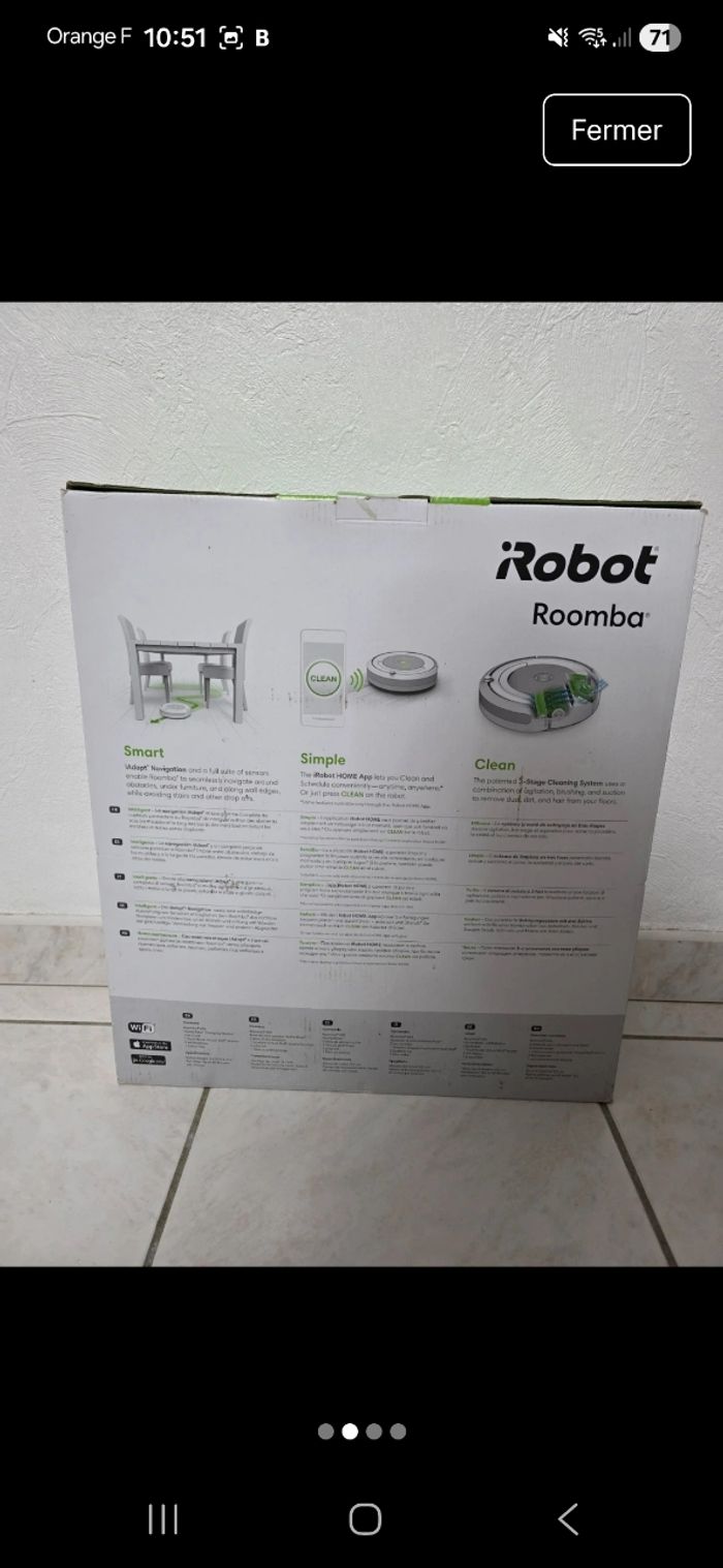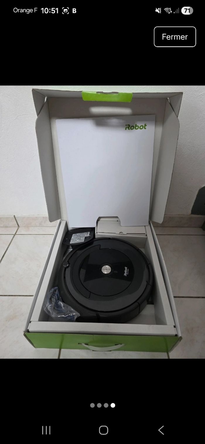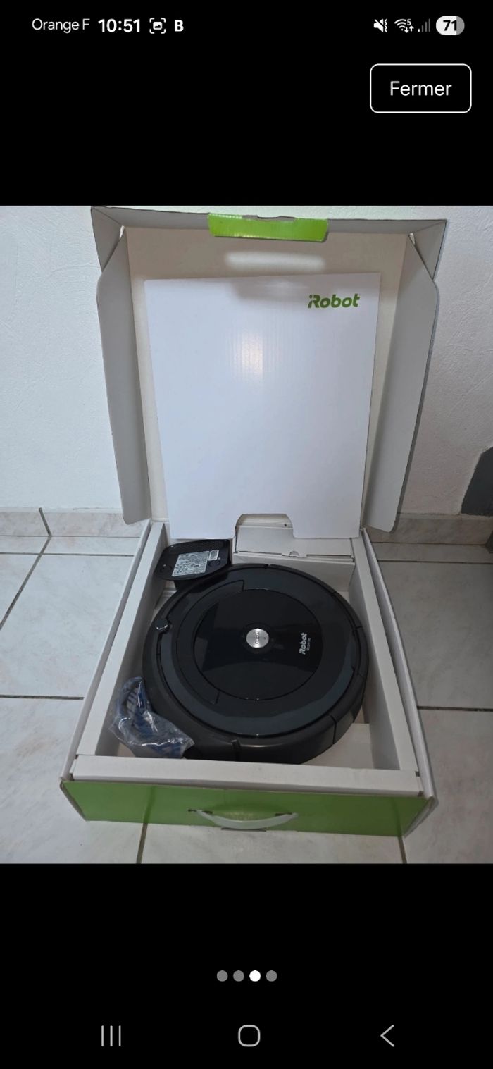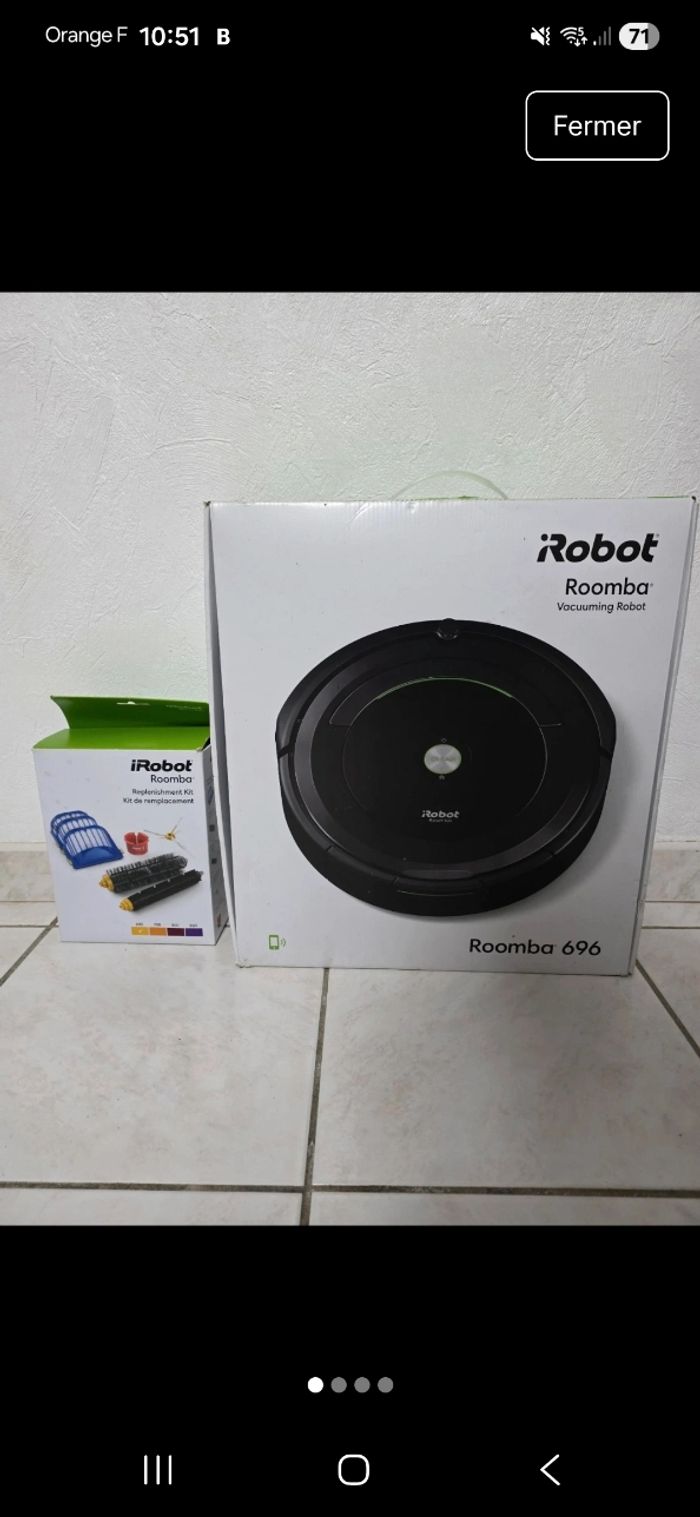 Bonjour , Je vends cet aspirateur robot Roomba 696 de la marque iRobot. Cet appareil performant et autonome vous aidera à garder votre maison propre en toute simplicité. - Type de produit : Aspirateur robot - Marque : iRobot - Modèle : Roomba 696 - Accessoires inclus : Kit de remplacement Très bon état général. N'hésitez pas à me contacter pour plus d'information