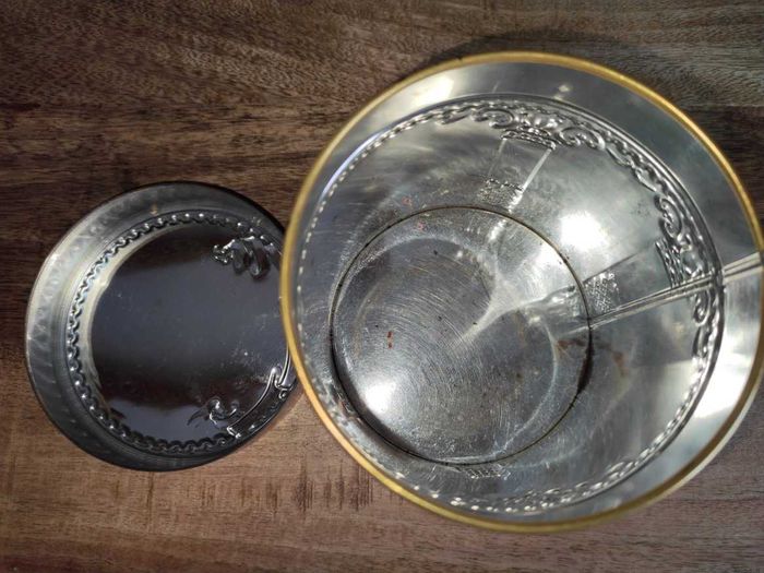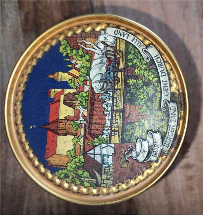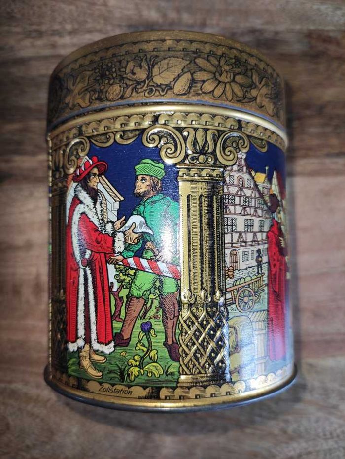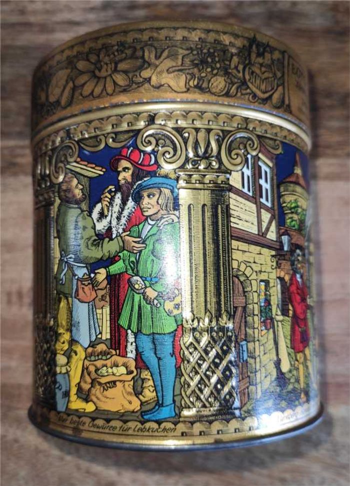Vintage 🎁 Boite métallique vide pains d'épices Nurnberger Inscription sur le couvercle: "Nurnberger tand ghet durch alle land" Inscription sur la boite: "E.Otto Schmidt Nurnberger Lebtuchenfabrit Derland von freinem Naturreinen Bienenhonig" "6 stuck feine Nurnberger Lebkuchen 300g" Hauteur 12 cm Diamètre 10,5 cm ⚠️👉 Vendu vide et tel que présenté sur photos .