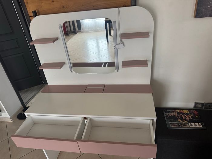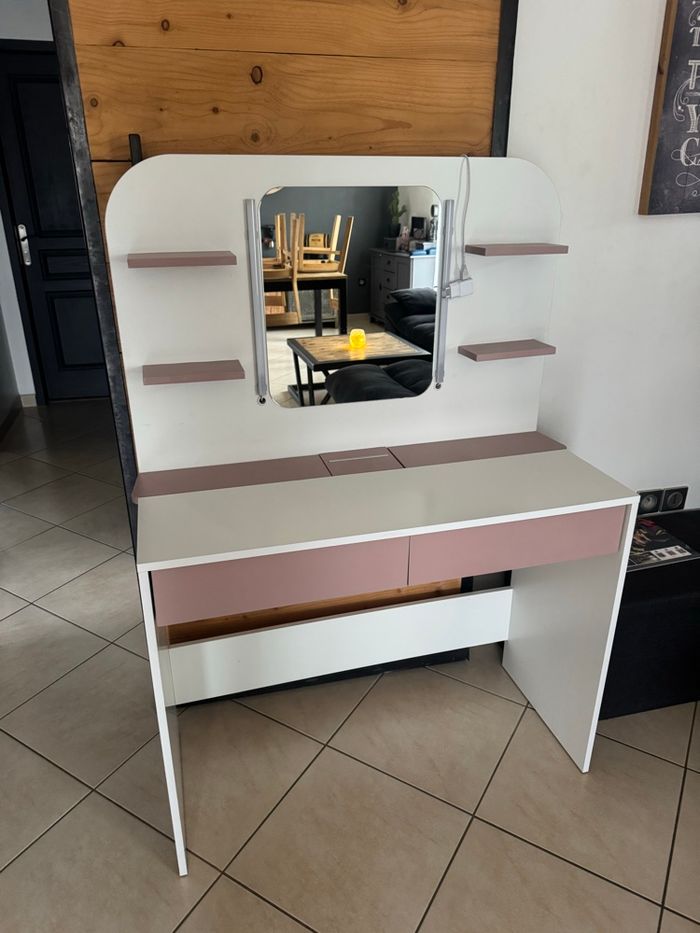 Je vends une coiffeuse en très bon état, idéale pour le maquillage ou la coiffure. Elle est pratique, élégante et offre un bel espace de rangement. 🪞 Miroir inclus 🗄️ Rangements fonctionnels ✨ Propre et bien entretenue 📏 Dimensions : 1,42m d’hauteur par 1,02m de largeur. 📍 À venir récupérer sur place. 💰 Prix : négociable dans la limite du raisonnable. N’hésite pas à me contacter pour plus d’informations ou de photos.