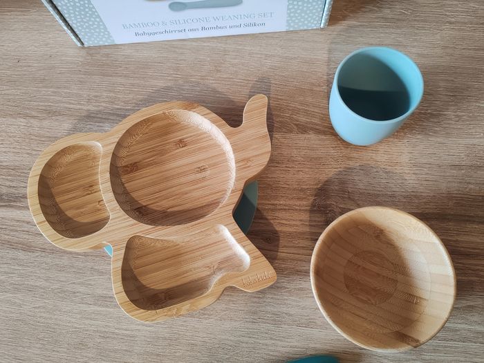 ⭐ Set de diversification ⭐ Koko kids - version éléphant En bambou et en silicone Assiette, bol, verre et 3 cuillères En très bon état