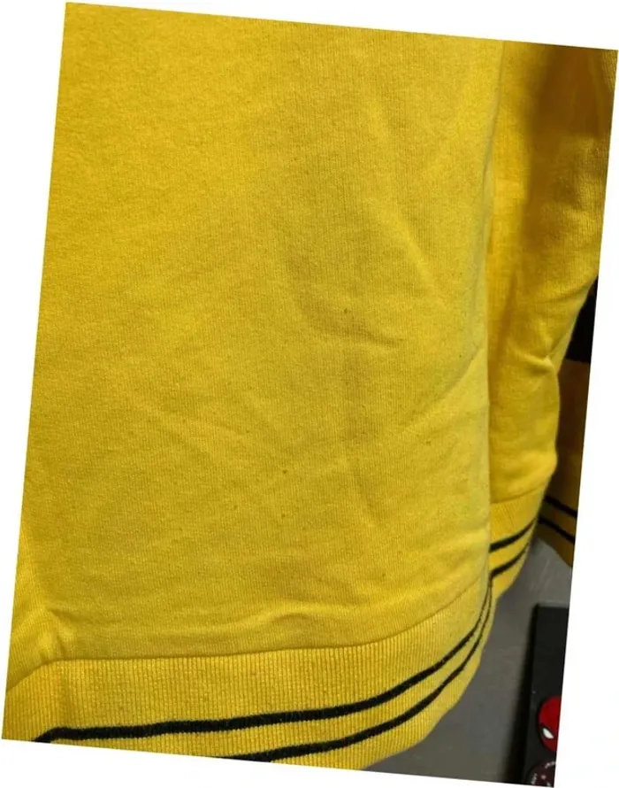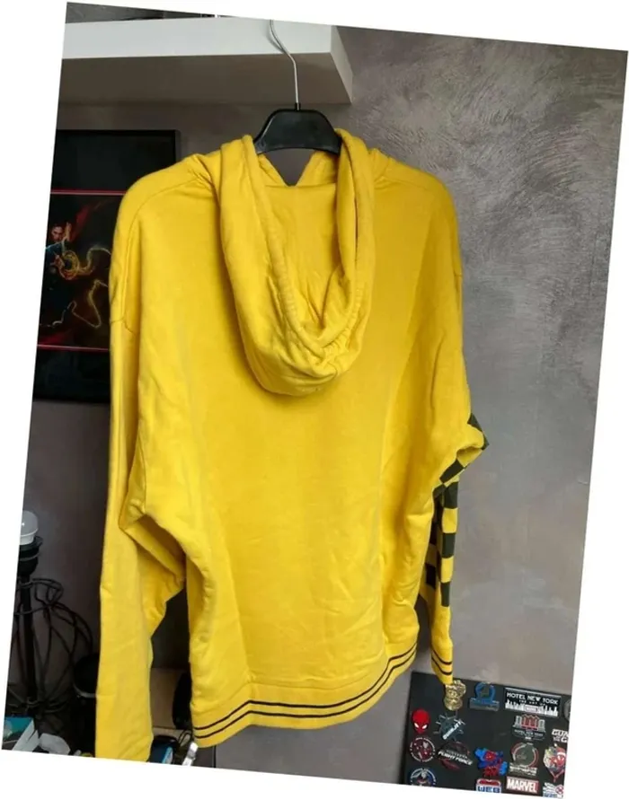 Bonjour, je vend un sweat à capuche noir et jaune oversize en taille XS de la marque Asos. Sweat 100% coton. Il est en très bon état général. La couleur noire a un peu décoloré et présente quelques petites peluches sur le bas à l’arrière. Sinon le reste est impeccable. Bas des manches et du sweat élastique. Inscription « Against Society » sur l’avant. Il a été lavé avant d’être mis en vente.