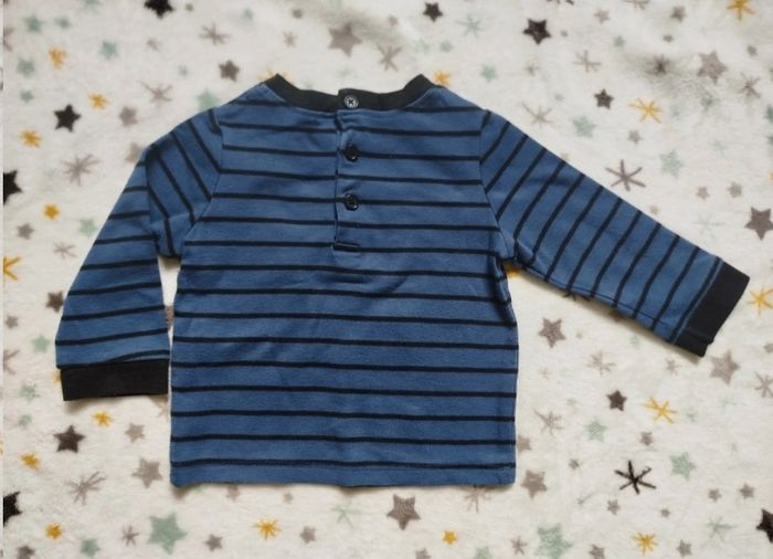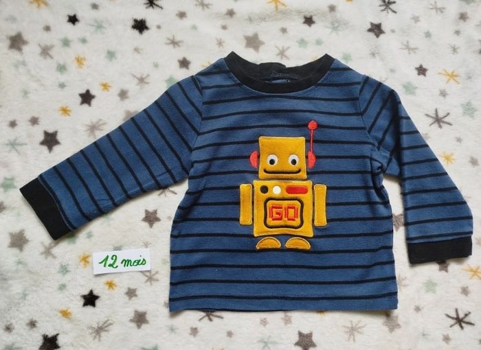 T-shirt manches bleu à rayures noires, motif robot jaune. Taille 12 mois. G83