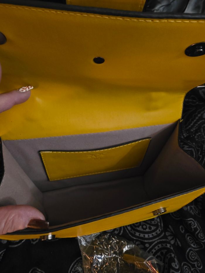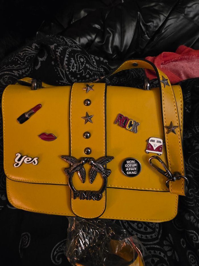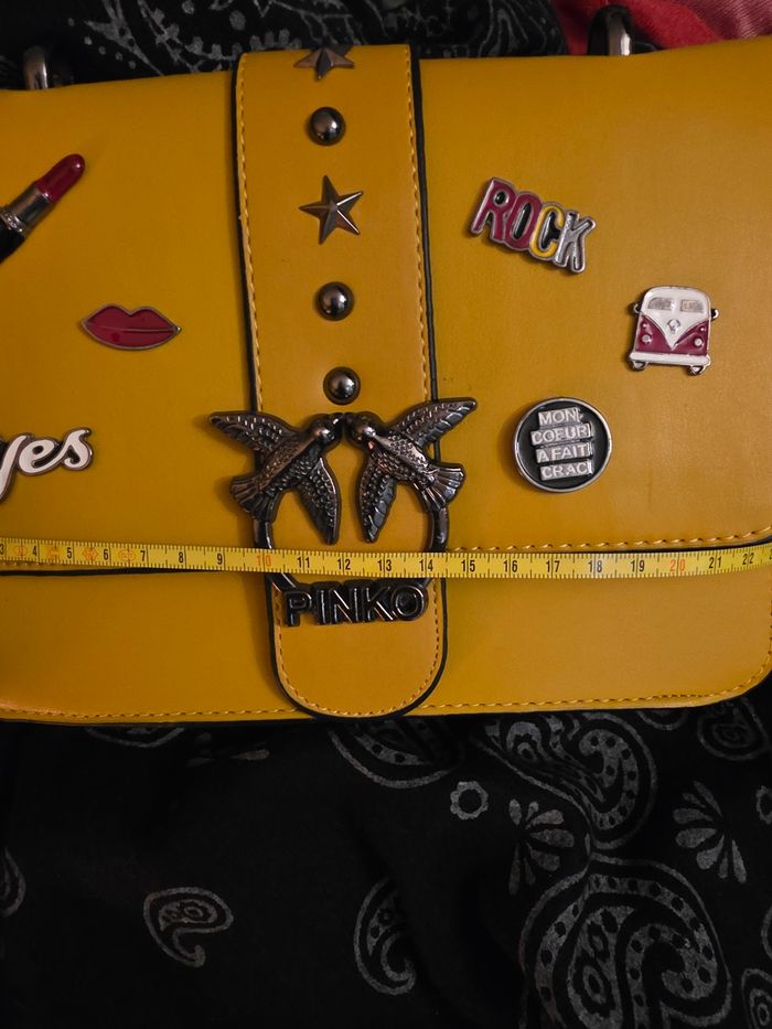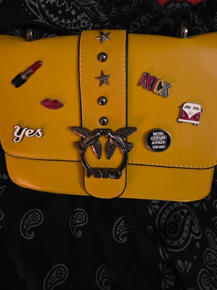 Très joli sac original avec ses pins couleur safran marque PINKO, bandoulière et chaînette détachable