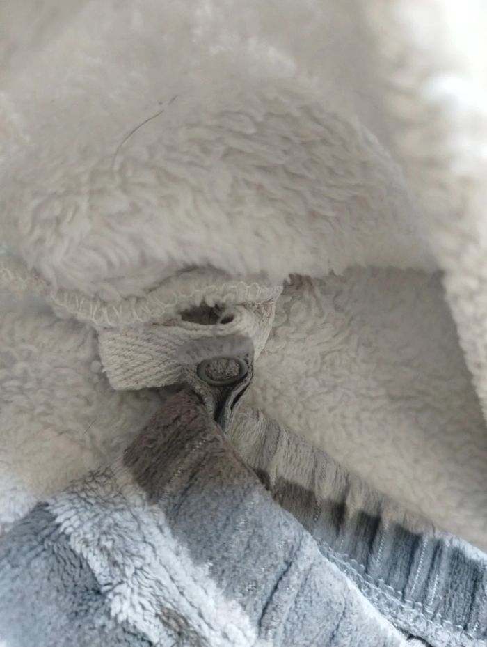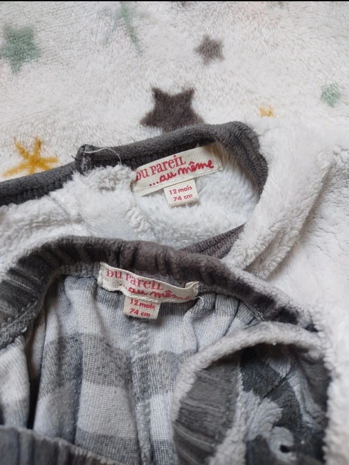 Pyjama chaud et tout doux gris et blanc raton laveur, 2 pièces. 1 pression de chaque côté afin de maintenir le haut et le bas ensemble. Du pareil au même, 12 mois. G197