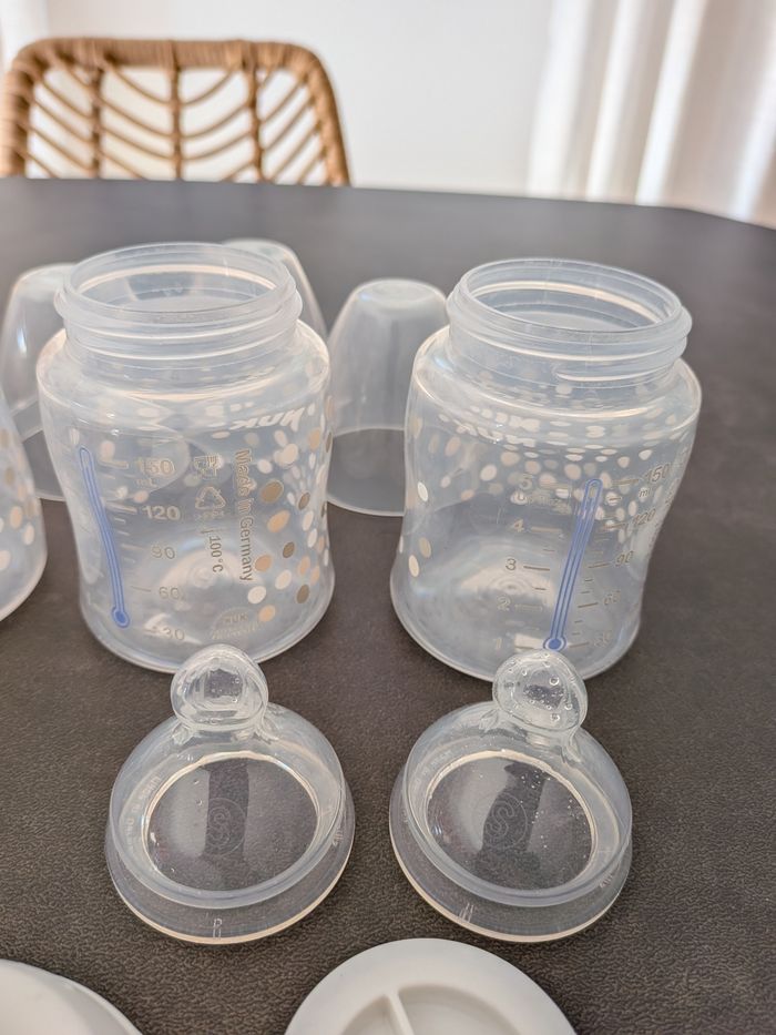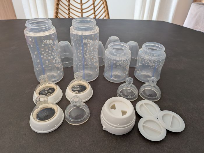 Lot de 4 biberons Nuk anti-colique avec tétines physiologiques (2 tétines taille S en 0-6 mois et 4 tétines taille M dont 2 en 0-6 mois et 2 en 6-18 mois). Il y a une bague à ajouter sur le biberon pour régler le débit si nécessaire. La ligne des graduations change de couleur en fonction de la température du lait (bleu trop froid et blanc bonne température). Les biberons sont comme neufs, ils ont juste été lavés mais ma fille a préféré une autre marque. Je vends également d'autres articles pour bébé dans mon dressing, n'hésitez pas à acheter en lot 😊