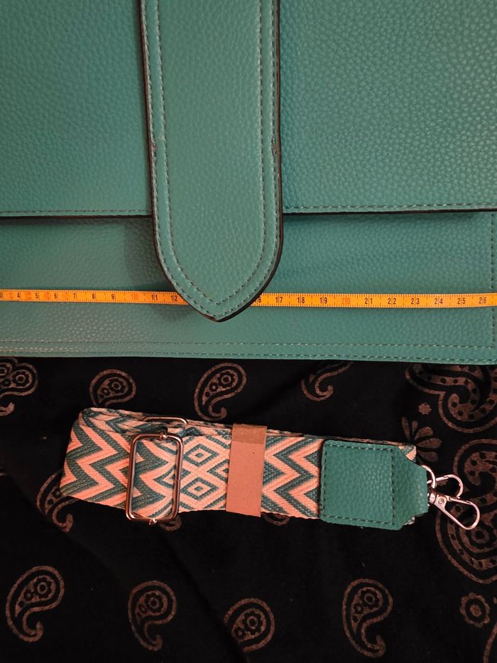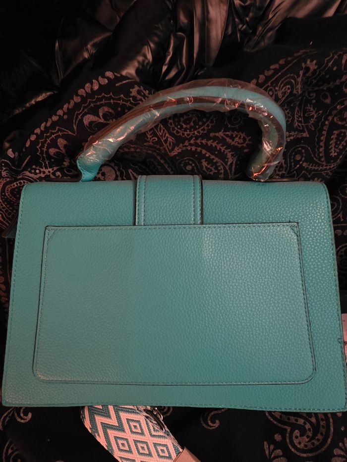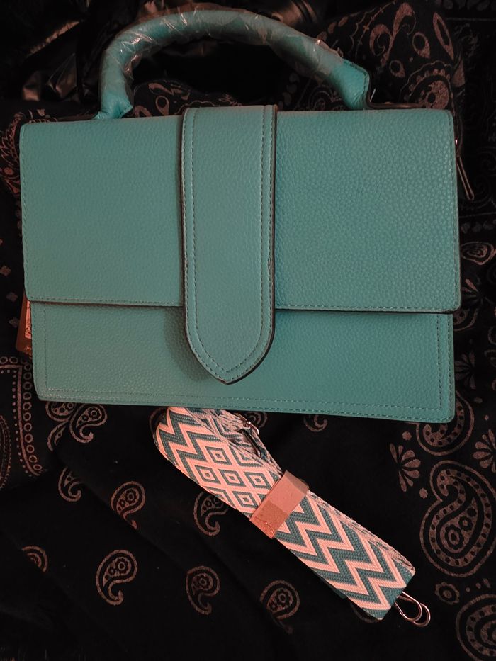 Joli 👜 à main grainé bleu turquoise avec poignée main et bandoulière colorée plusieurs poches intérieur et une derrière