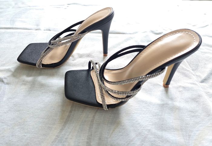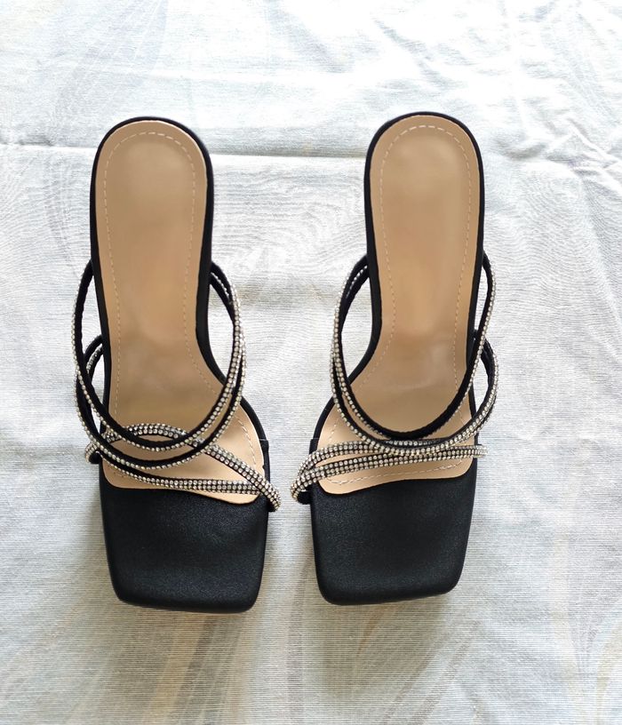 ​✨ ÉTAT : Très bon état. Les sandales sont impeccables, les strass sont tous bien fixés et brillants. Les semelles sont très propres. ​📏 TAILLE & COUPE : Pointure 35. Modèle avec bout carré moderne et talon fin élégant. ​🌿 MATIÈRE : Matière satinée noire et brides croisées ornées de strass argentés. ​📦 LIVRAISON : Envoi via Mondial Relay (lockers), Shop2Shop ou Chronopost (point relais physique). ​🎁 Réductions sur les lots activées ! C'est le moment de craquer pour plusieurs articles.