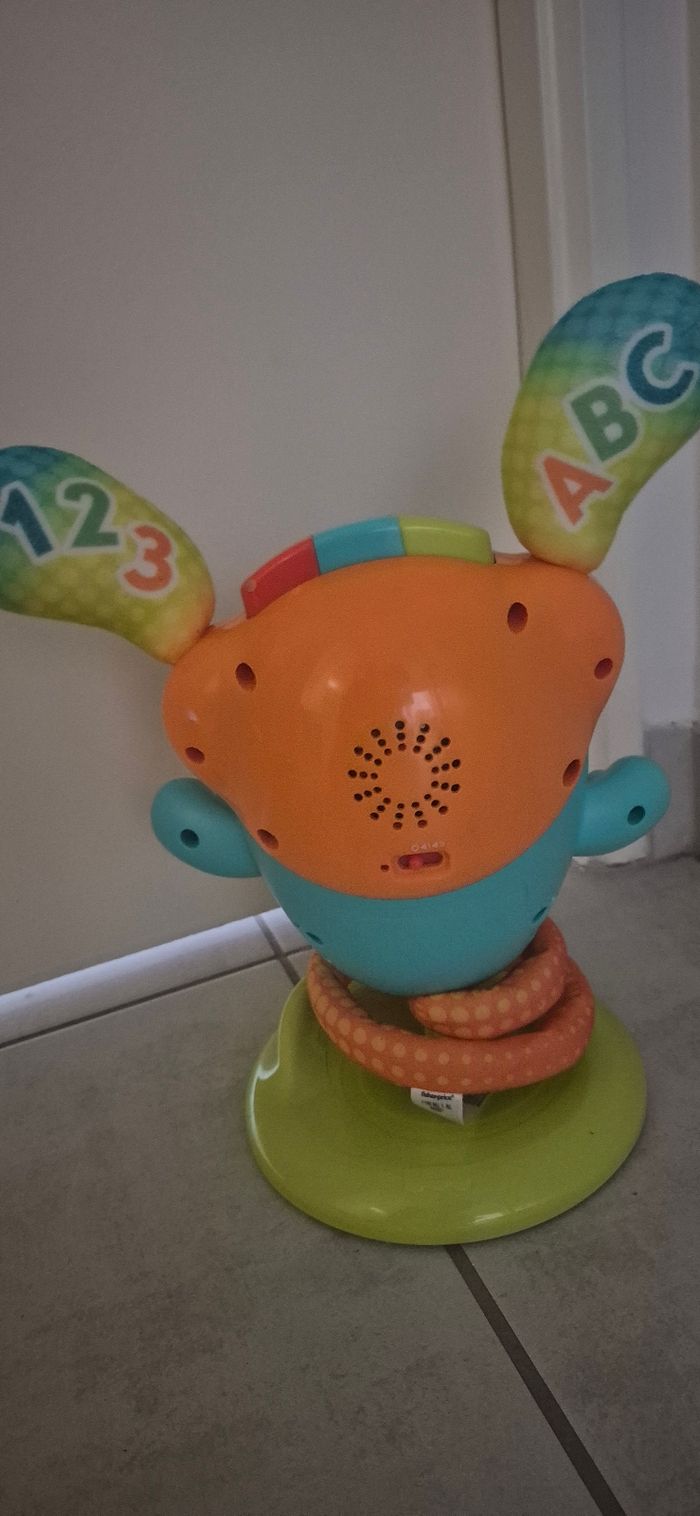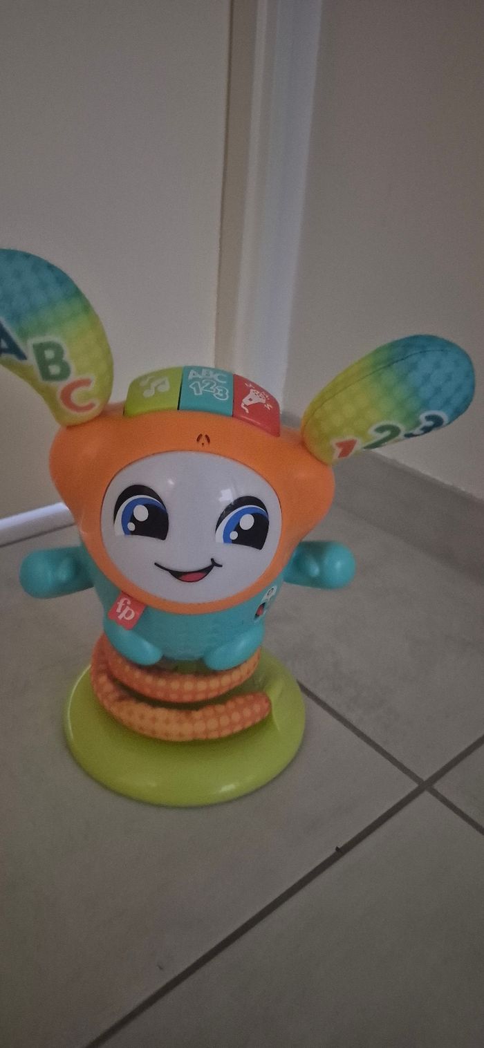 DJ robot Fisher Price Très bon état peu servi "Quand bébé appuie sur les boutons, le compagnon de danse interactif se met à sautiller. Ses mouvements sont accompagnés de lumières colorées et de plus de 75 chansons, sons et phrases pour apprendre à l’enfant l’alphabet, les chiffres, les couleurs et plus encore. Avec 3 niveaux d’apprentissage Éveil Progressif et des mouvements amusants, Mon Petit DJ est un jouet qui enchantera les petits danseurs en leur offrant un jeu rigolo qui donne envie de bouger et d’apprendre."