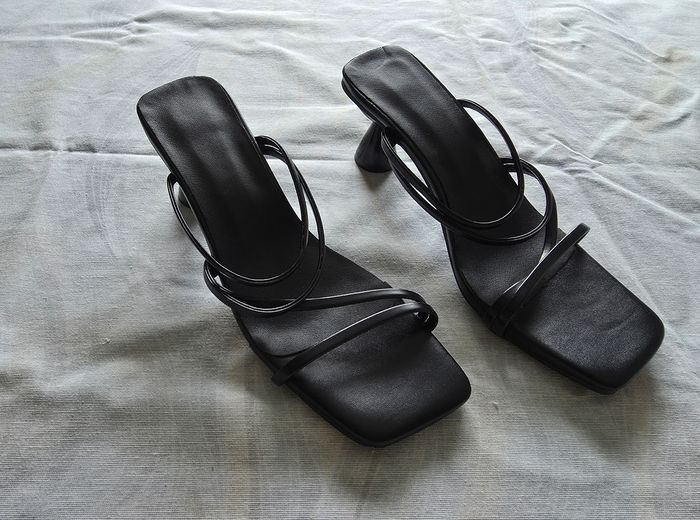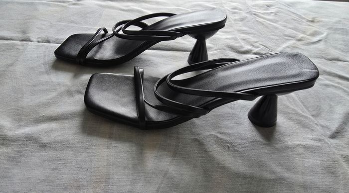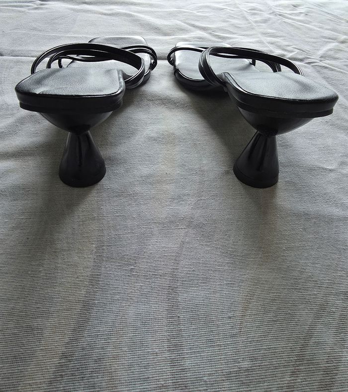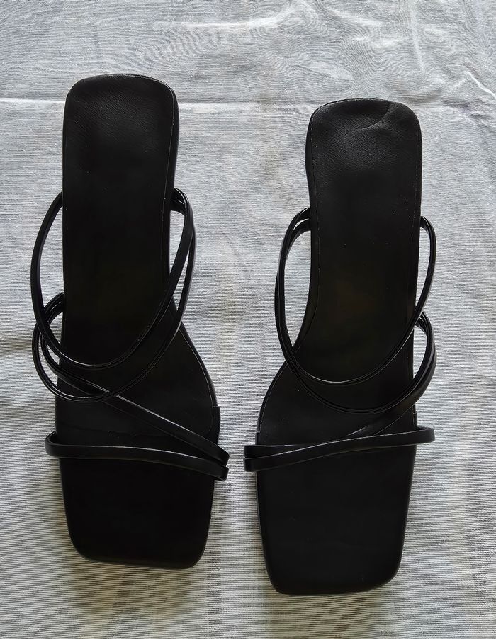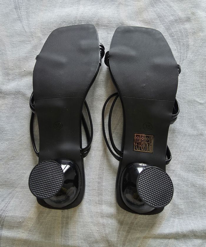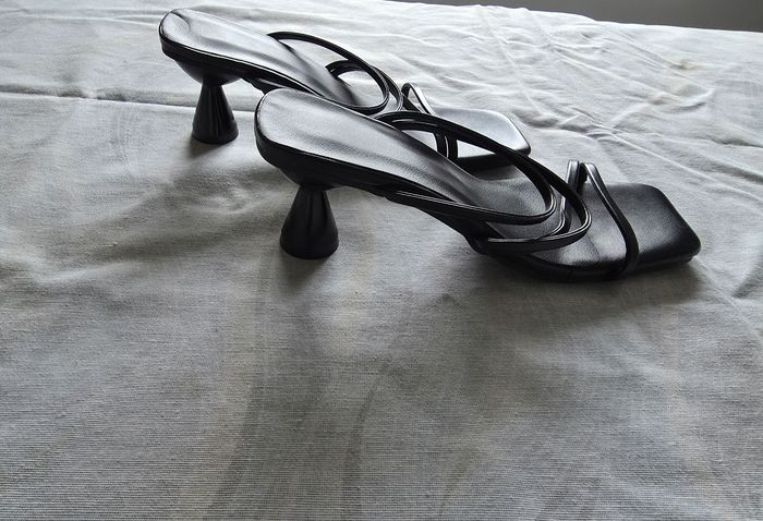 ​✨ ÉTAT : Bon état. À noter un petit défaut sur la semelle intérieure (voir photo), d'où le prix mini. C'est totalement invisible une fois les chaussures portées. ​📏 TAILLE & COUPE : Pointure 35. Modèle avec un talon "bobine" évasé d'environ 7 cm et un bout carré très actuel. ​🌿 MATIÈRE : Aspect cuir lisse noir. Design épuré avec brides fines. ​📦 LIVRAISON : Envoi via Mondial Relay (lockers), Shop2Shop ou Chronopost (point relais physique). ​🎁 Réductions sur les lots activées ! Profitez-en pour faire un petit tour dans mon dressing.