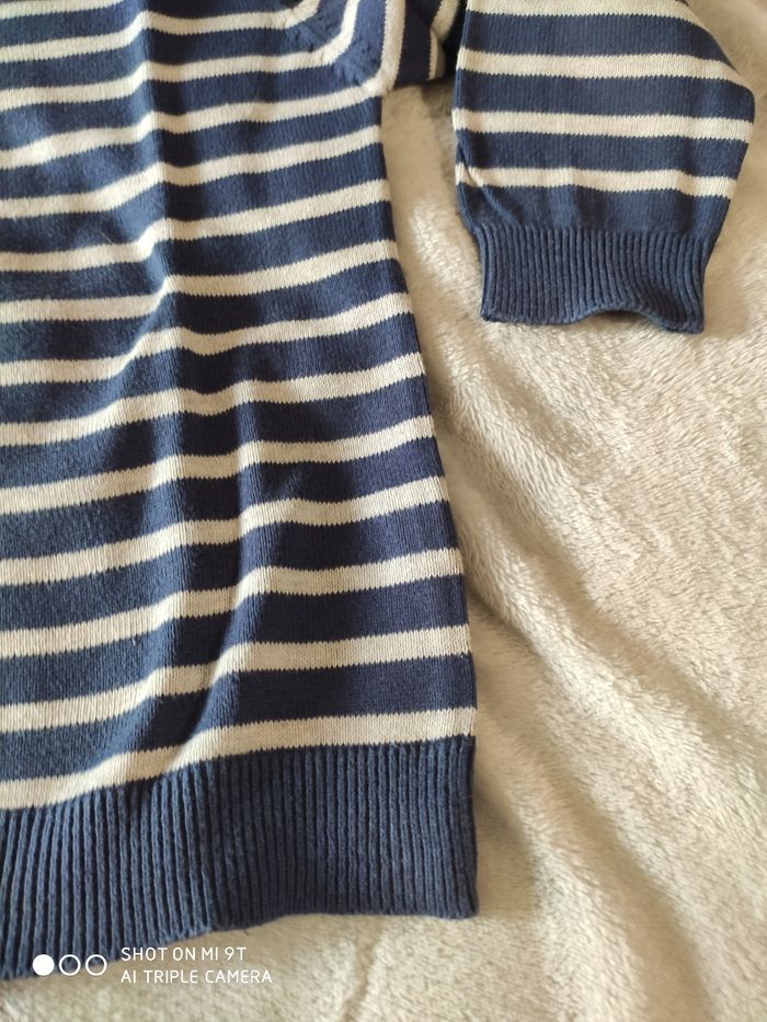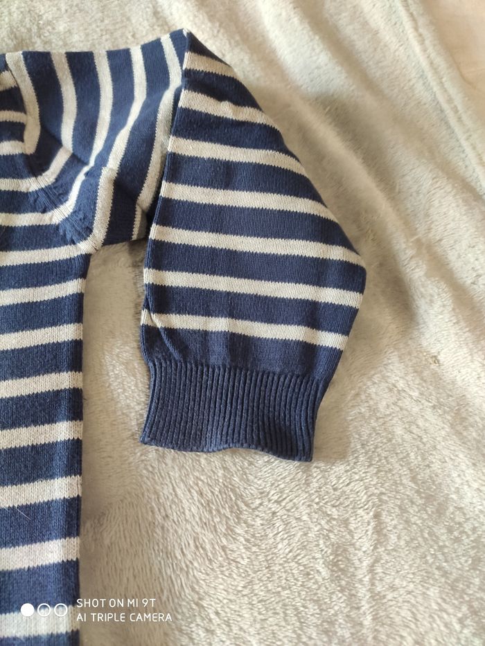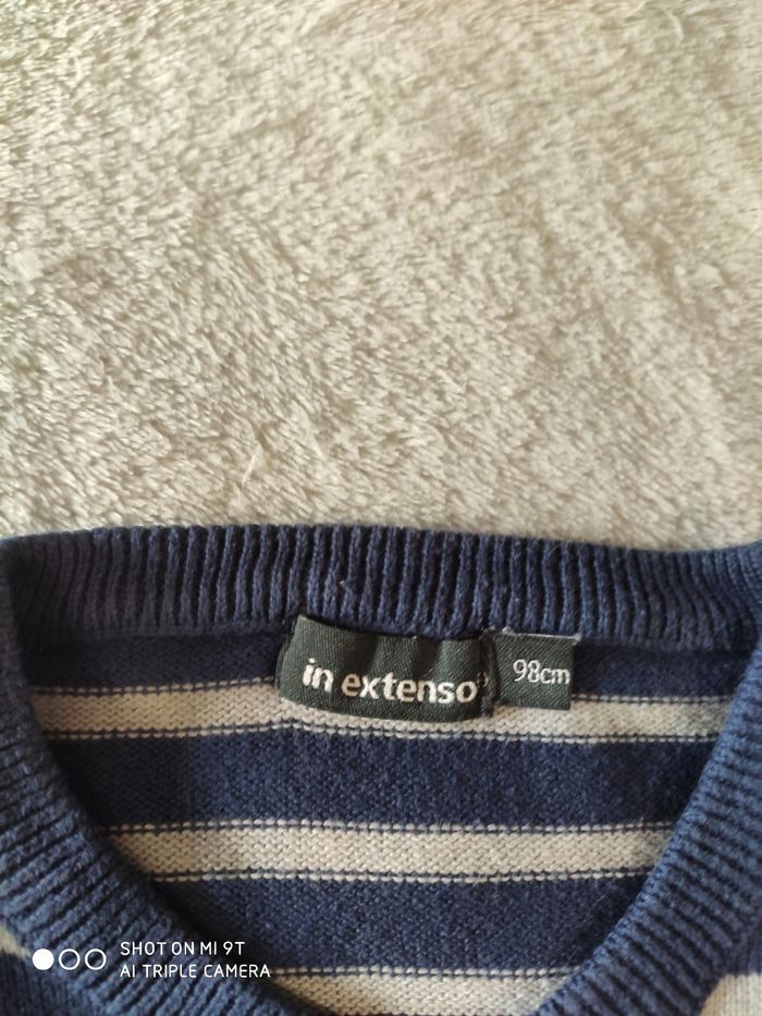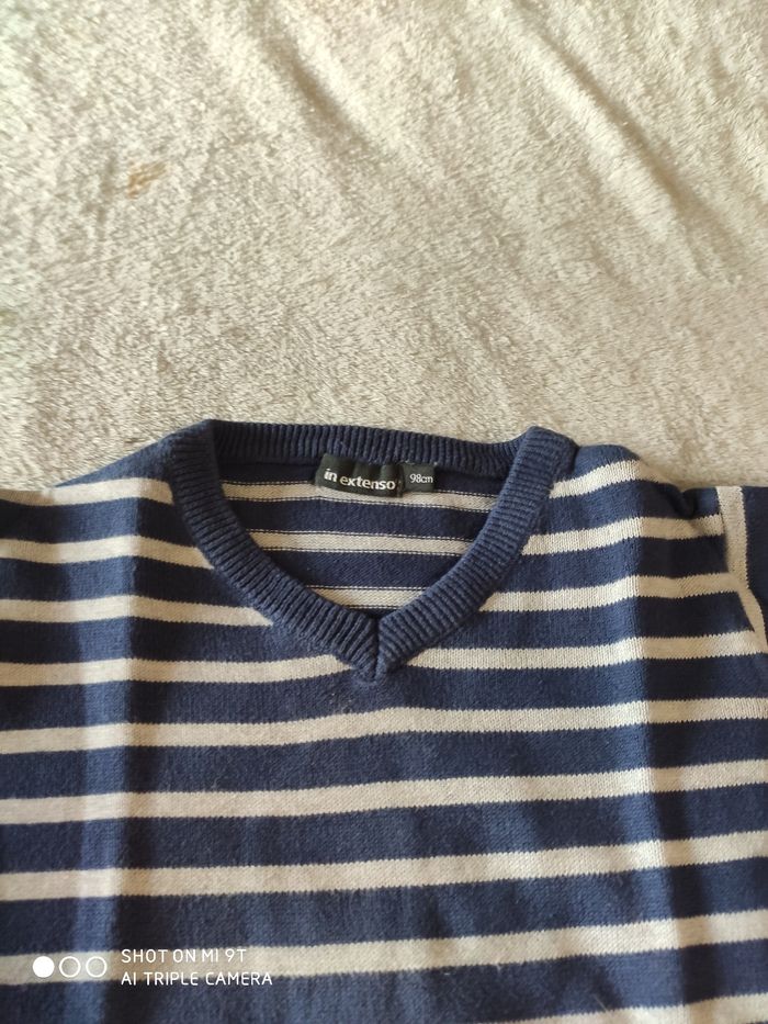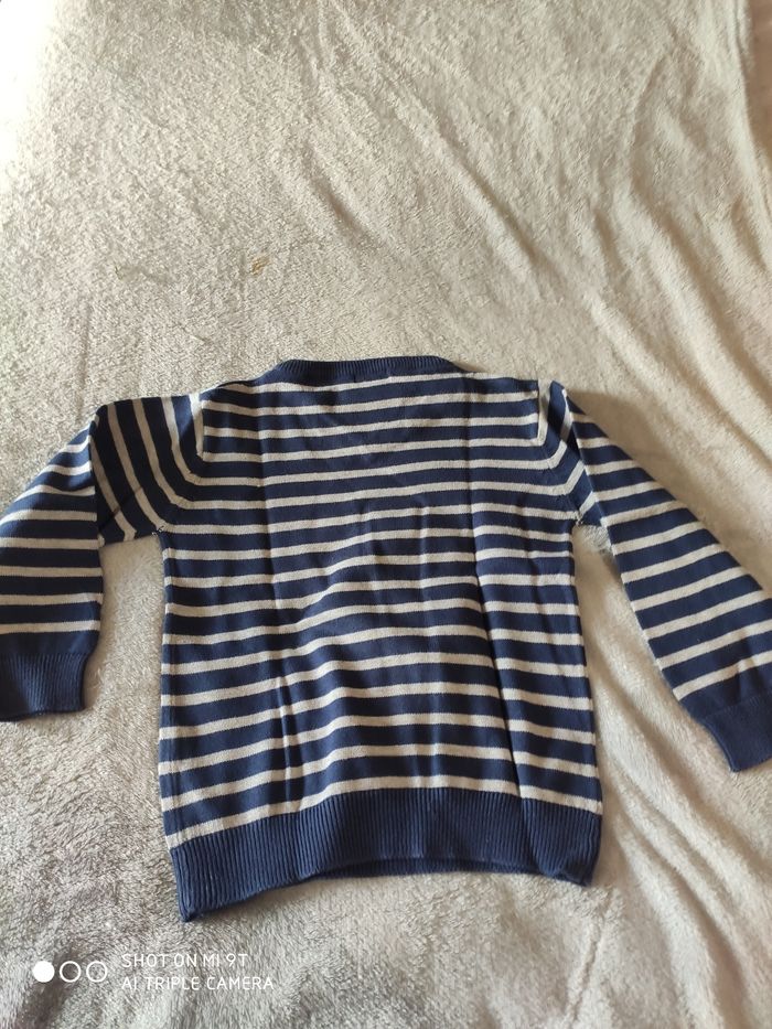 Pull garçon taille 3 ans en très bon état, pas de tâches ni trous. Couleur bleu marine à rayures blanc, col en V de chez in extenso. Taille correctement et peu porté par un seul enfant sur une saison.