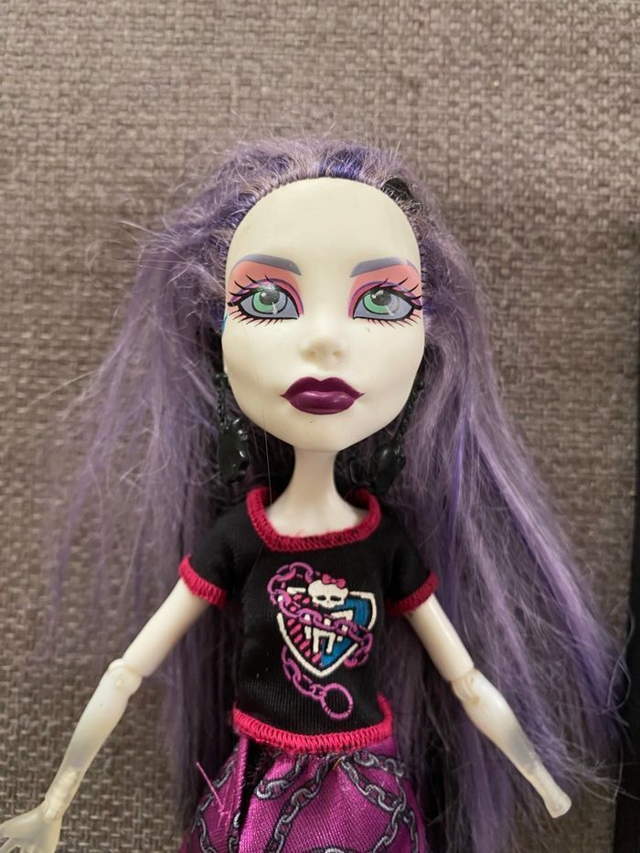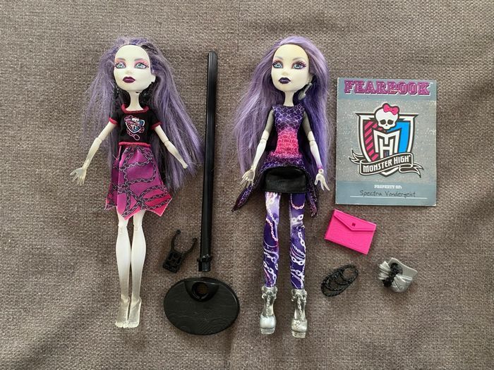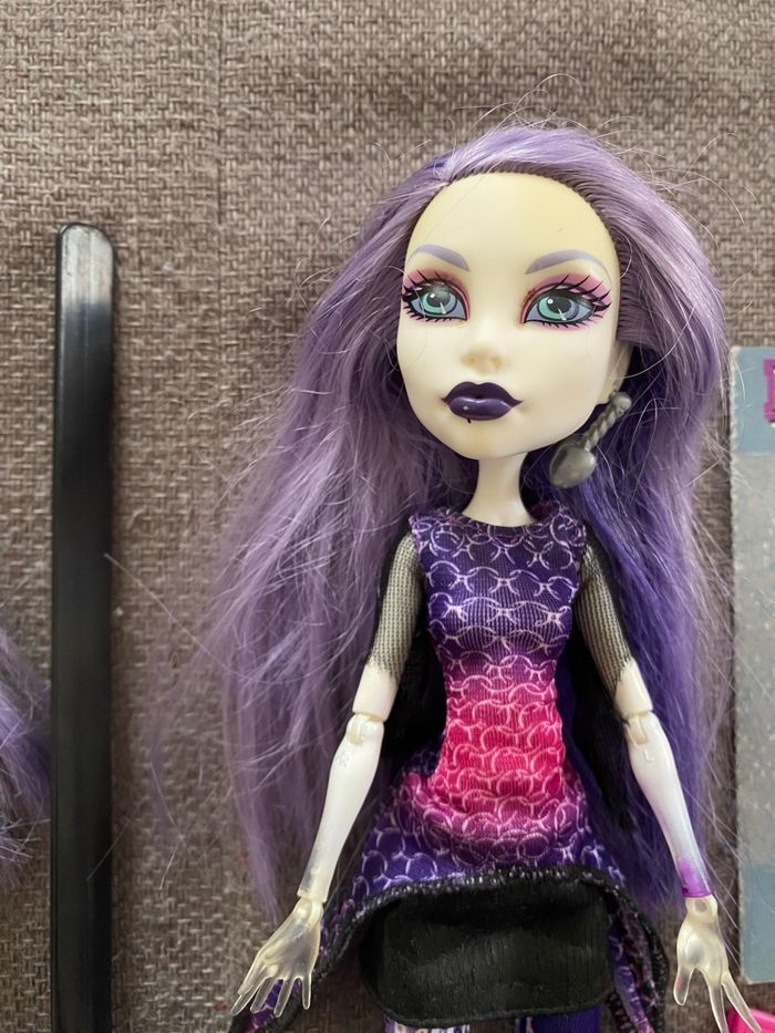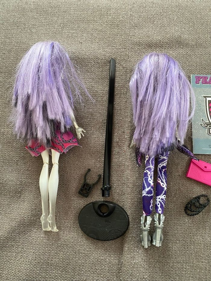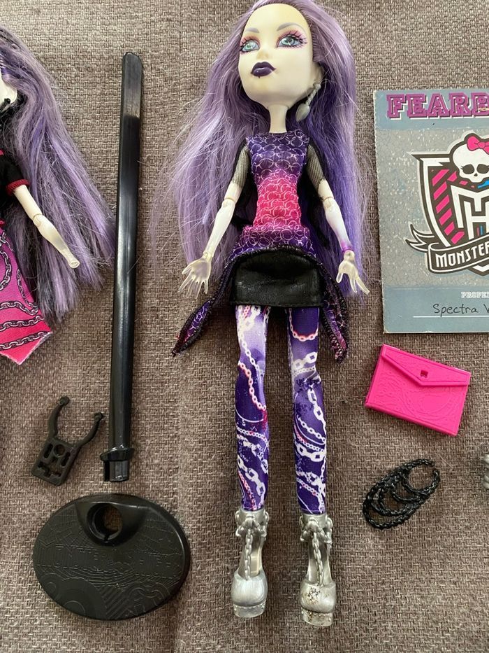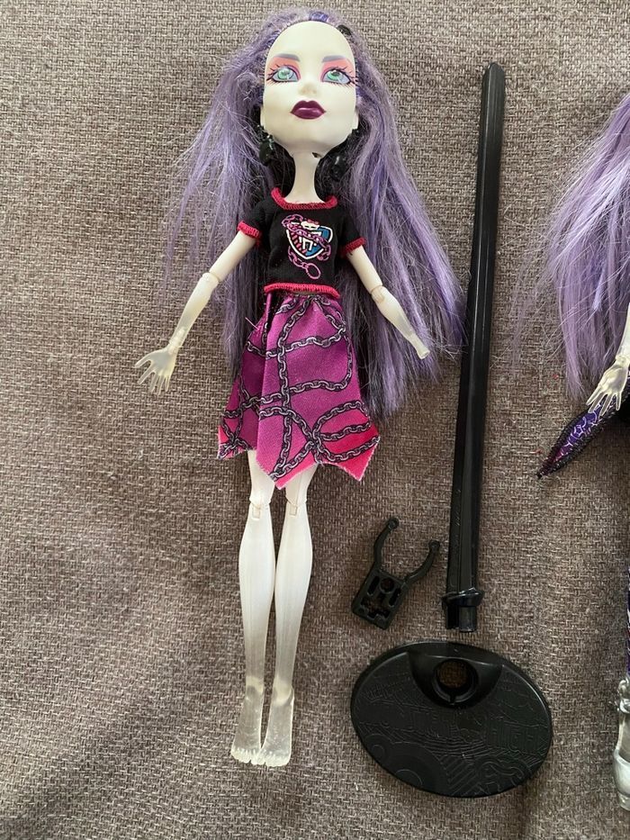 Lot de deux poupées Spectra Vondergeist : - série Ghoul Spirit (il lui manque une main, pas d’élastique) - série Class Photo (pas d’élastique) Monster High Vous achetez ce que vous voyez sur les photos